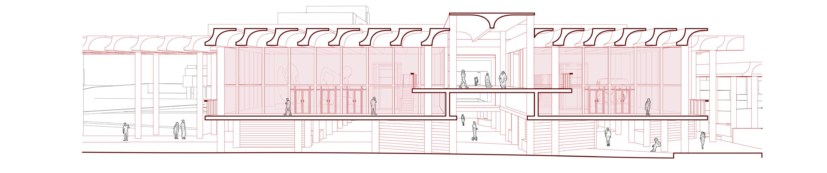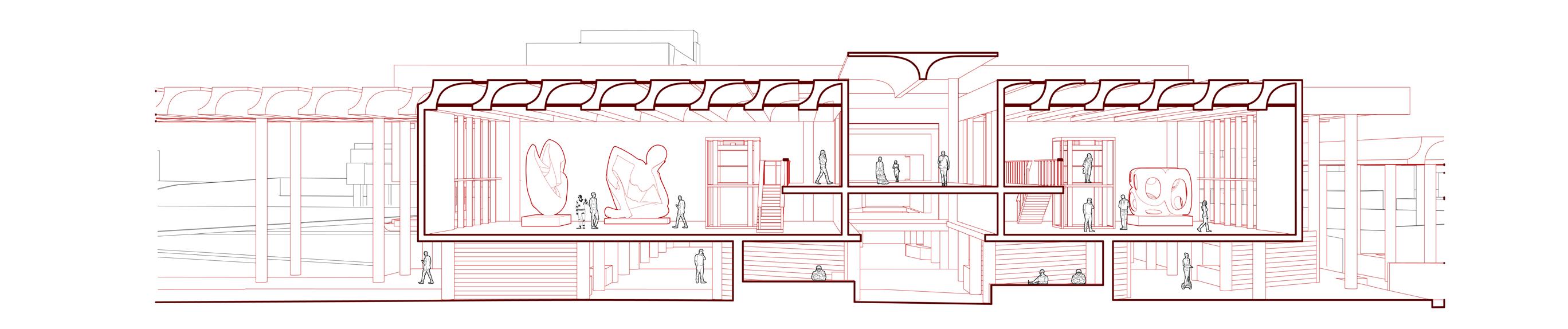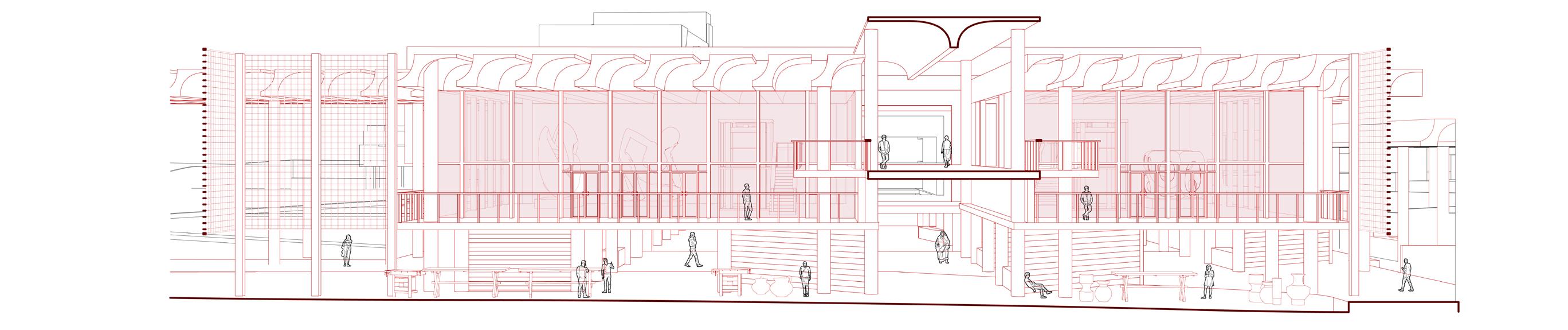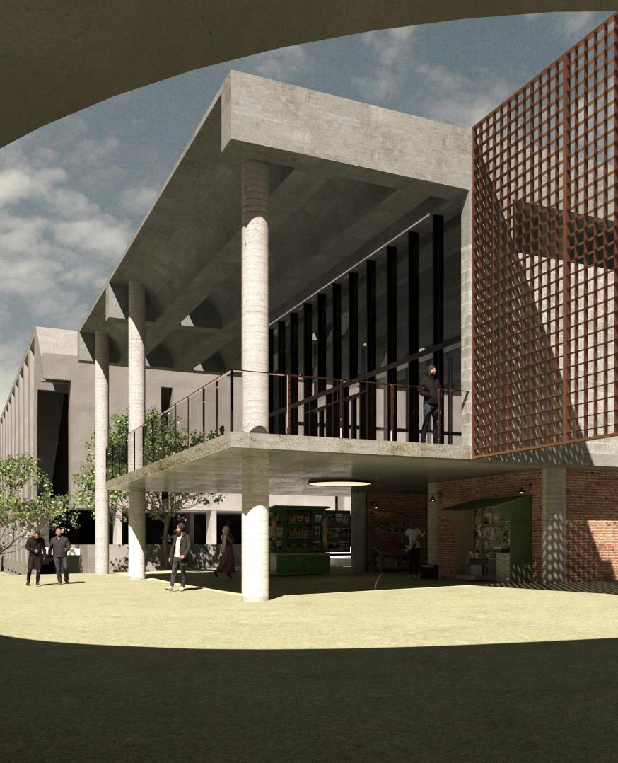 Located in Ahmedabad, India, Sanskar Kendra is a modernist art museum designed by Corbusier. Although the museum was originally intended to be an innovative symbol of modernism and showcase a new museum typology, the museum is currently in a state of disrepair and receives almost no weekly visitors. Many modernist monuments across the world have suffered the same fate as Sanskar Kendra, being monuments of a bygone era that have either been abandoned or are being slated to be demolished. Thus, this project that I have designed is meant to revive Sanskar Kendra and its surrounding site. Keeping in mind that Ahmedabad was a important centre of art and crafts in modern India, I decided to design a holistic complex that would combine both local Indian craft traditions with artworks created by famous Indian artists. This way, people visiting the newly refurbished museum would experience a variety of art forms in a way that is integrated into one whole. Thus, the ground floor of the museum, designed to be a bazaar-like space, contains workshops and stalls for craftspeople and artists to sell their wares while the upper floors contain the gallery spaces for storing famous Indian artworks. Architecturally, the complex is meant to be a natural extension of Sanskar Kendra and its pinwheel composition. The essence of the entire building revolves around a central walkway that extends from one of the four main walkways of Sanskar Kendra. Blocks of space are then arranged around this central walkway with the blocks being aligned strictly to the grid set in place by Sanskar Kendra.