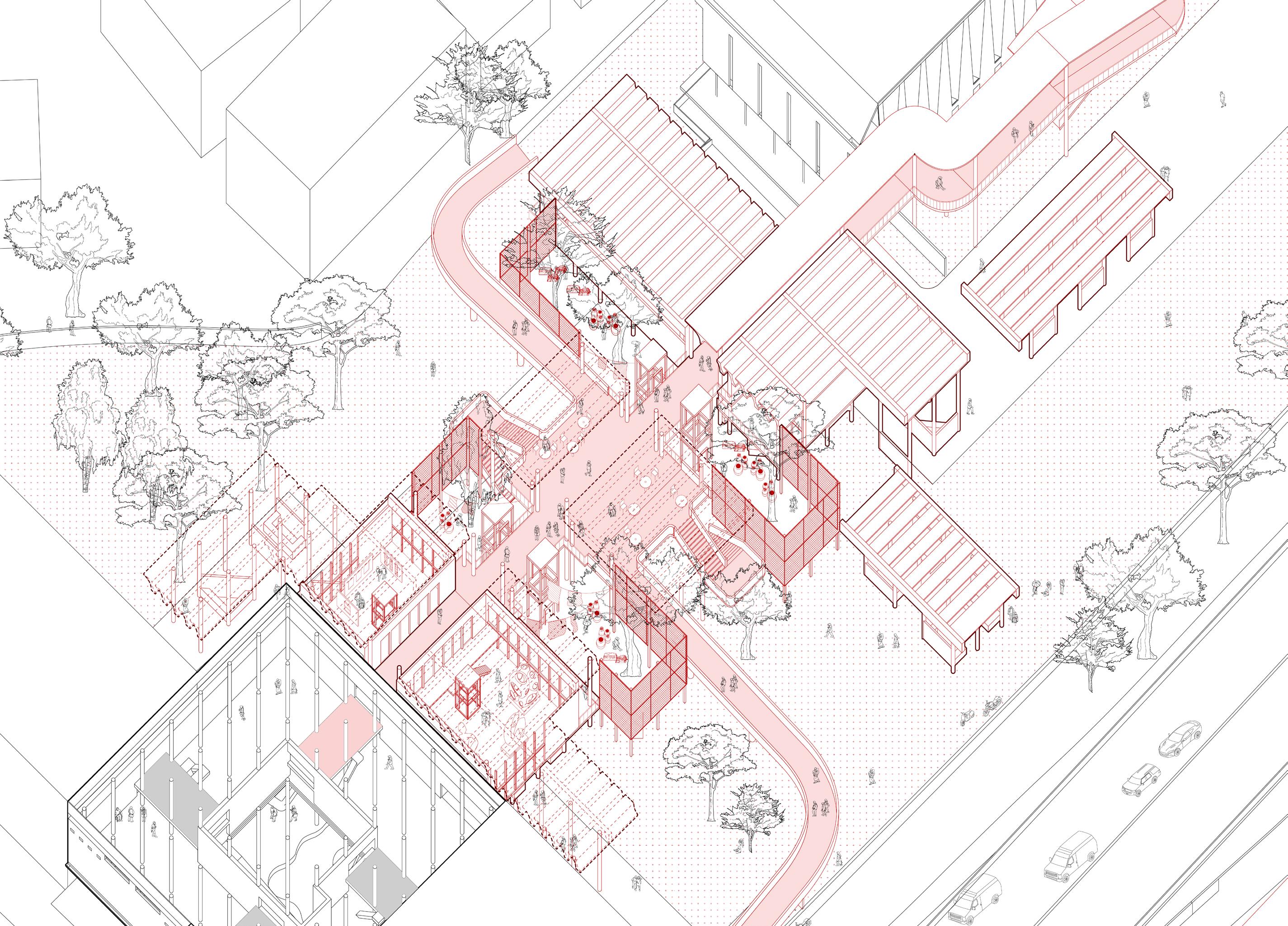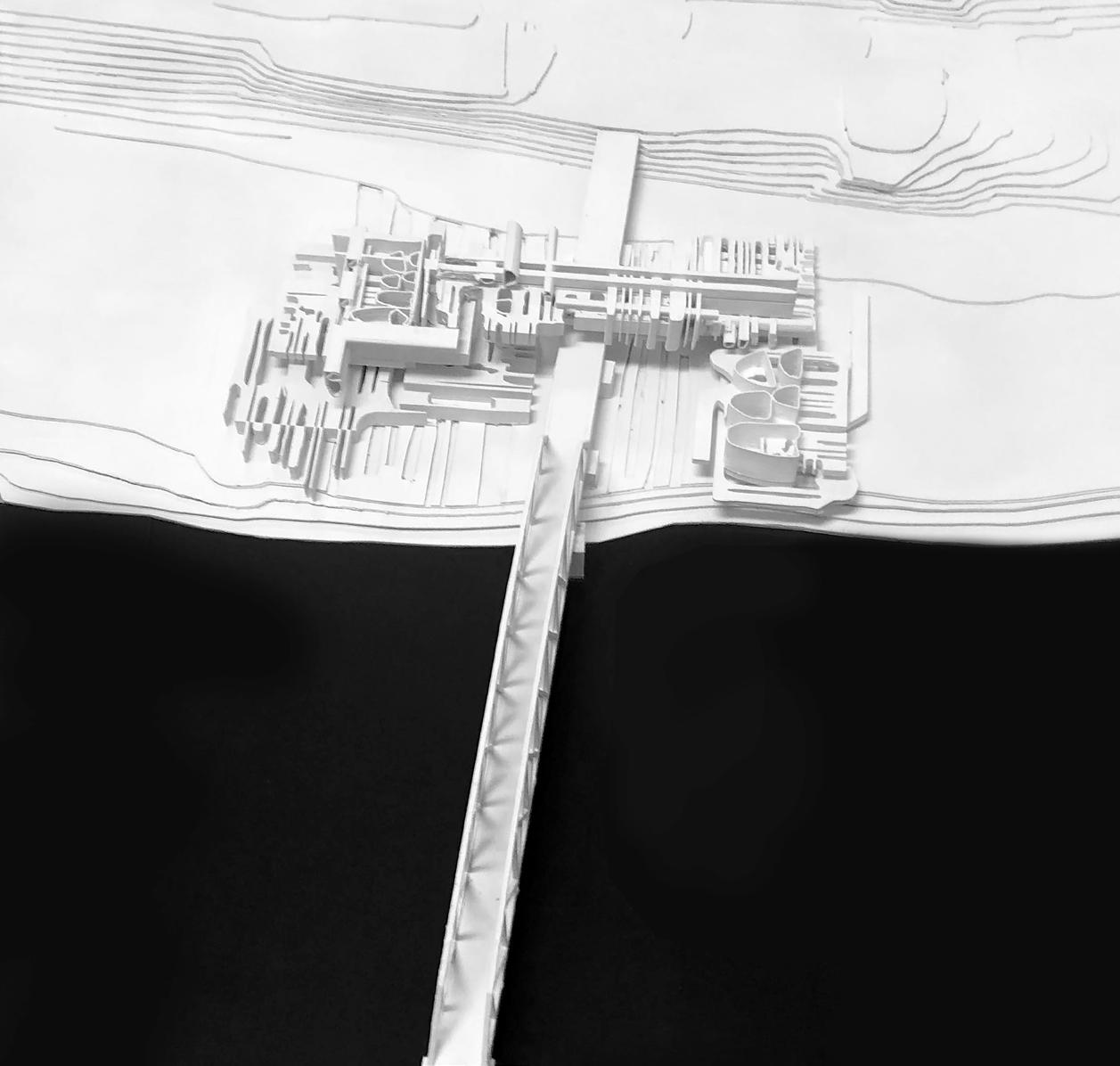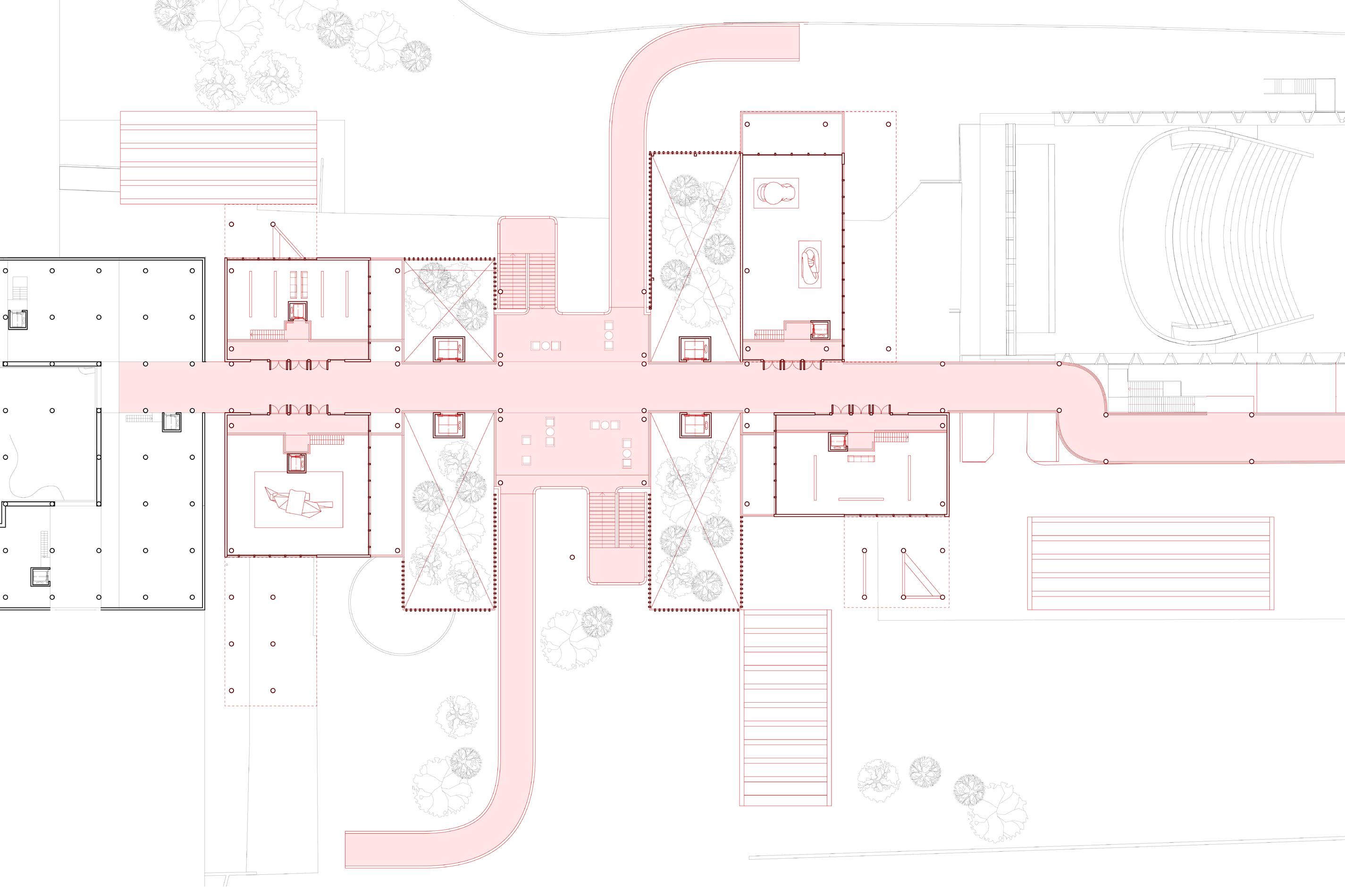Located in Ahmedabad, India, Sanskar Kendra is a modernist art museum designed by Corbusier. Although the museum was originally intended to be an innovative symbol of modernism and showcase a new museum typology, the museum is currently in a state of disrepair and receives almost no weekly visitors. Many modernist monuments across the world have suffered the same fate as Sanskar Kendra, being monuments of a bygone era that have either been abandoned or are being slated to be demolished. Thus, this project that I have designed is meant to revive Sanskar Kendra and its surrounding site. Keeping in mind that Ahmedabad was a important centre of art and crafts in modern India, I decided to design a holistic complex that would combine both local Indian craft traditions with artworks created by famous Indian artists. This way, people visiting the newly refurbished museum would experience a variety of art forms in a way that is integrated into one whole. Thus, the ground floor of the museum, designed to be a bazaar-like space, contains workshops and stalls for craftspeople and artists to sell their wares while the upper floors contain the gallery spaces for storing famous Indian artworks. Architecturally, the complex is meant to be a natural extension of Sanskar Kendra and its pinwheel composition. The essence of the entire building revolves around a central walkway that extends from one of the four main walkways of Sanskar Kendra. Blocks of space are then arranged around this central walkway with the blocks being aligned strictly to the grid set in place by Sanskar Kendra.