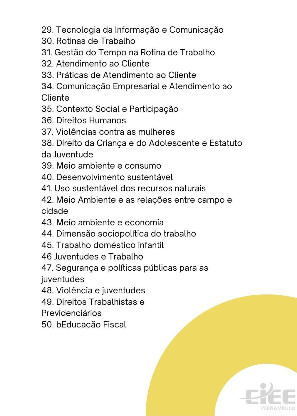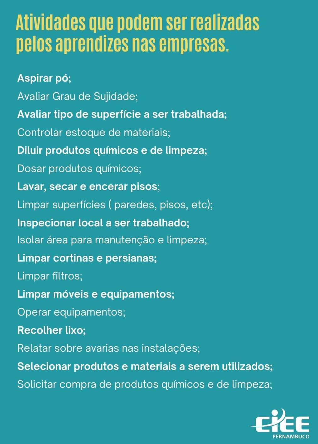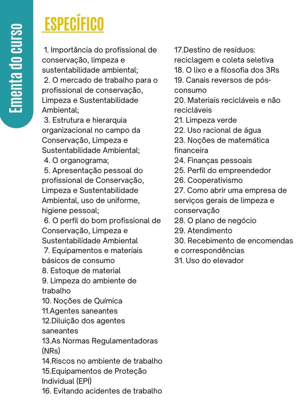 É composto do Módulo Mundo do Trabalho e do Módulo Específico que trabalha o desenvolvimento de aptidões gerais e específicas, exigidas no mundo do trabalho e estimula a ressignificação da prática e vivência do jovem em suas atividades na empresa, além de sua autonomia e atuação cidadã. Todo o conteúdo é embasado nas alíneas da portaria 723/2012 do MTE e das atividades previstas no CBO 514320 (Faxineiro).