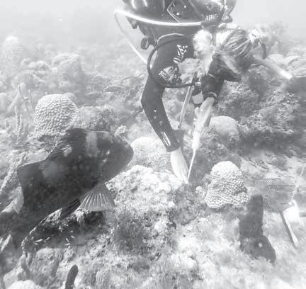 MICHELLE DOBLER/Contributed2. NSU graduate research assistant Amanda Zummo treats an infected coral as a grouper cheers her on. Divers CONTRIBUTED