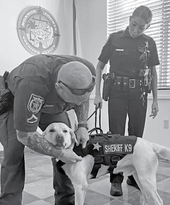 Monroe County Sheriff’s K-9 Mako took a break from the drug sniffing on Aug. 25. With his handler, traffic enforcement deputy Aaron Roddy, the two visited the Roth Building in Tavernier where Mako was fitted with a new piece of equipment aimed to keep him a little safer while serving the community.