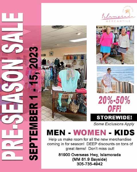 2 UPPER KEYS WEEKLY / AUGUST 31, 2023 KEY LARGO 305-451-5700 MM 99 Median KEY WEST 305-295-6400 Searstown by Publix MARATHON 305-743-4397 MM 50 Oceanside SUGGESTED RETAIL ONE-OF-A-KINDS • SCRATCH ‘N’ DENTS • DISCONTINUED MERCHANDISE BUY IT TODAY – GET IT TODAY! SIZZLIN’ SUMMER CLEARANCE SIZZLIN’ SUMMER CLEARANCE 10-50% OFF Save Storewide IN EVERY DEPT! www.RoyalFurnitureAndDesign.com