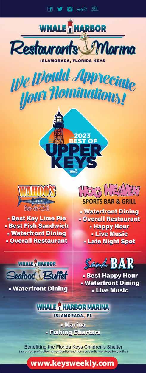 Voting for the finalists in each category begins at 12:01 a.m. on Oct. 12 and ends at 11:59 p.m. on Oct. 29 at keysweekly.com. During this stage, voters can submit one ballot per day and must fill out 75% of the categories to cast a valid ballot. So visit keysweekly.com often throughout the process and submit one ballot a day. Updates and reminders will be provided at keysweekly. com, in our daily e-blast, Upper Keys Weekly print editions and social media. The winners’ celebration is Nov. 11 p.m. at Whale Harbor Events.