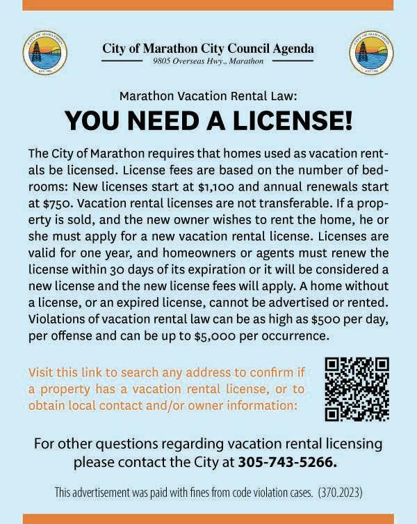 The budget includes $400,000 to help fund the city’s first-time home buyers’ program, along with $8.5 million allocated to begin Marathon’s required deep wastewater injection well project. Other appropriations include $265,000 for City Hall improvements, $400,000 for new fire hydrants, $2.2 million for construction at the Seven Mile Marina, $100,000 for design of a multi-use facility on 33rd Street, $470,000 for Oceanfront Park improvements, $350,000 for Seven Mile Park improvements, $400,000 for new bathroom facilities at the Quay, $616,000 for Marathon Community Park improvements and $2.3 million for road and bridge improvements.