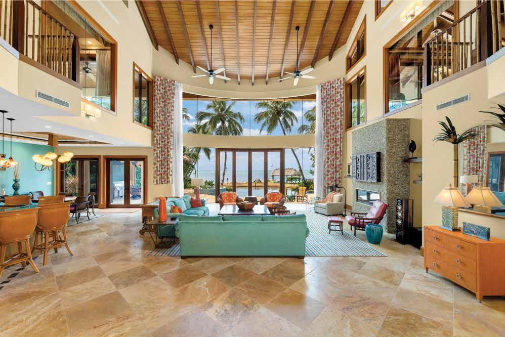 This exquisite bayfront Islamorada property features a main home with four bedrooms, four full bathrooms, and two half bathrooms, along with a guest house offering two bedrooms and one bathroom. The kitchen features marble countertops, a gas range, and counter seating. With a separate dining area and 30 ft high ceilings in the great room, floor-to-ceiling windows offer breathtaking views of the bay waters and dynamic sunset skies. The infinity edge pool with a spa offers reflections of beautiful palms and exquisite landscaping. The outdoor cabana kitchen is perfect for al fresco dining, and the boat basin with dockage allows for easy access to the waters of Florida Bay. A whole-house generator ensures uninterrupted comfort and tiki torches light the backyard terraces. Don't miss the waterfalls cascading into the boat basin, creating a truly serene retreat.