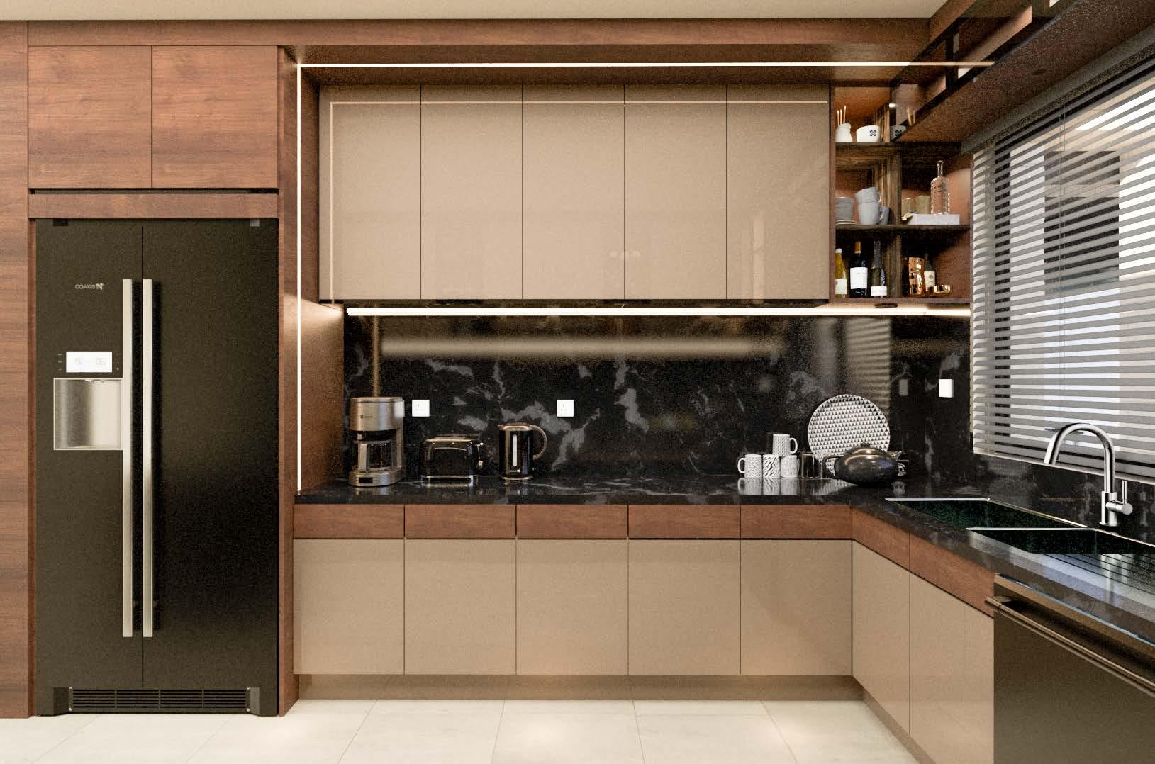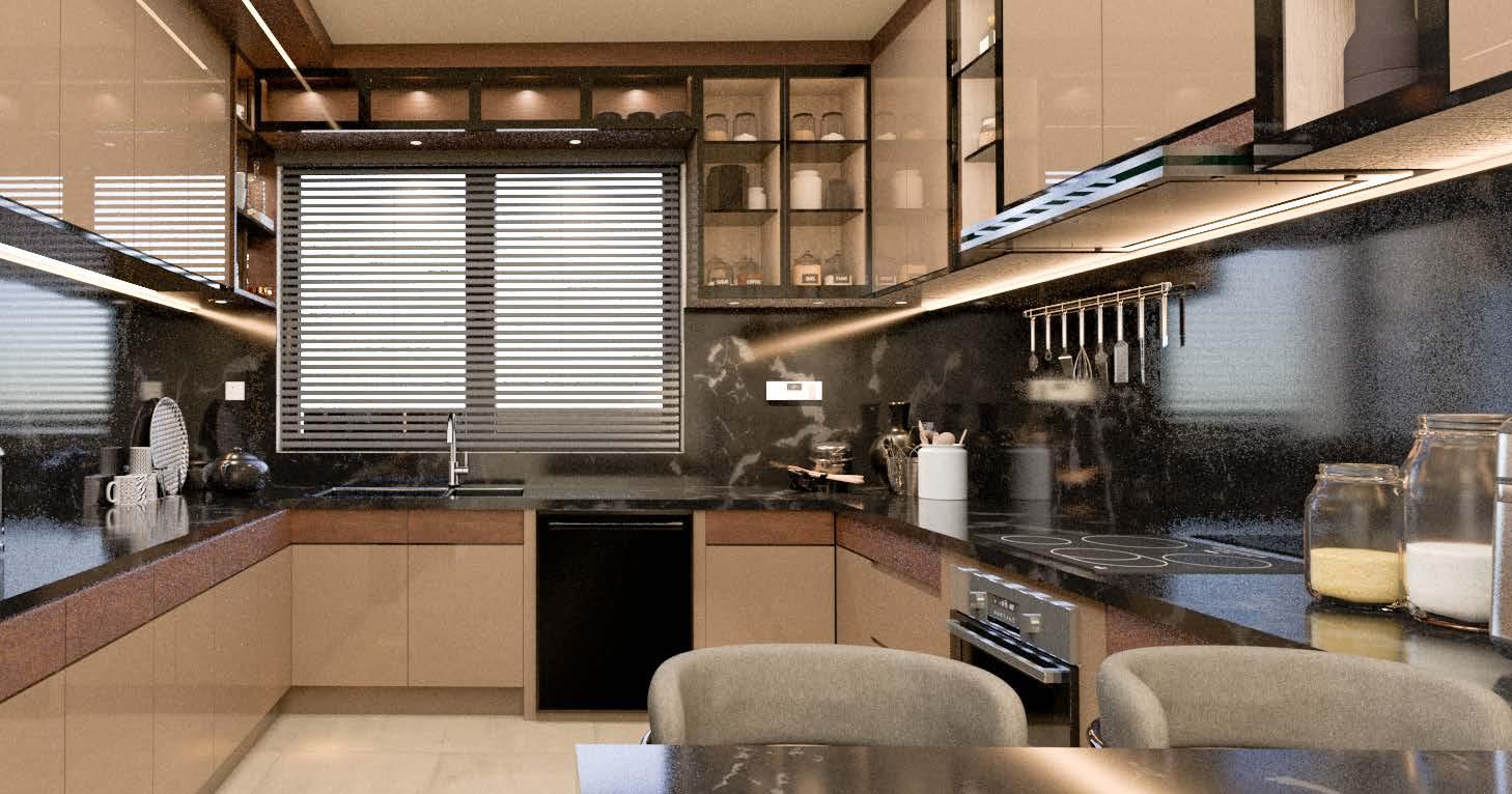 This kitchen design balances functionality and aesthetics with a seamless workflow through the circulation triangle, ensuring efficiency. The petrol gold cabinetry contrasts elegantly with rich wood textures and bold black marble, creating a sophisticated yet warm ambiance. Open shelving and integrated lighting enhance both practicality and style, making the space highly functional while maintaining a sleek, modern look.
