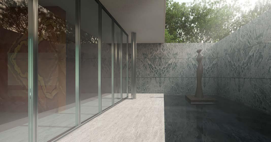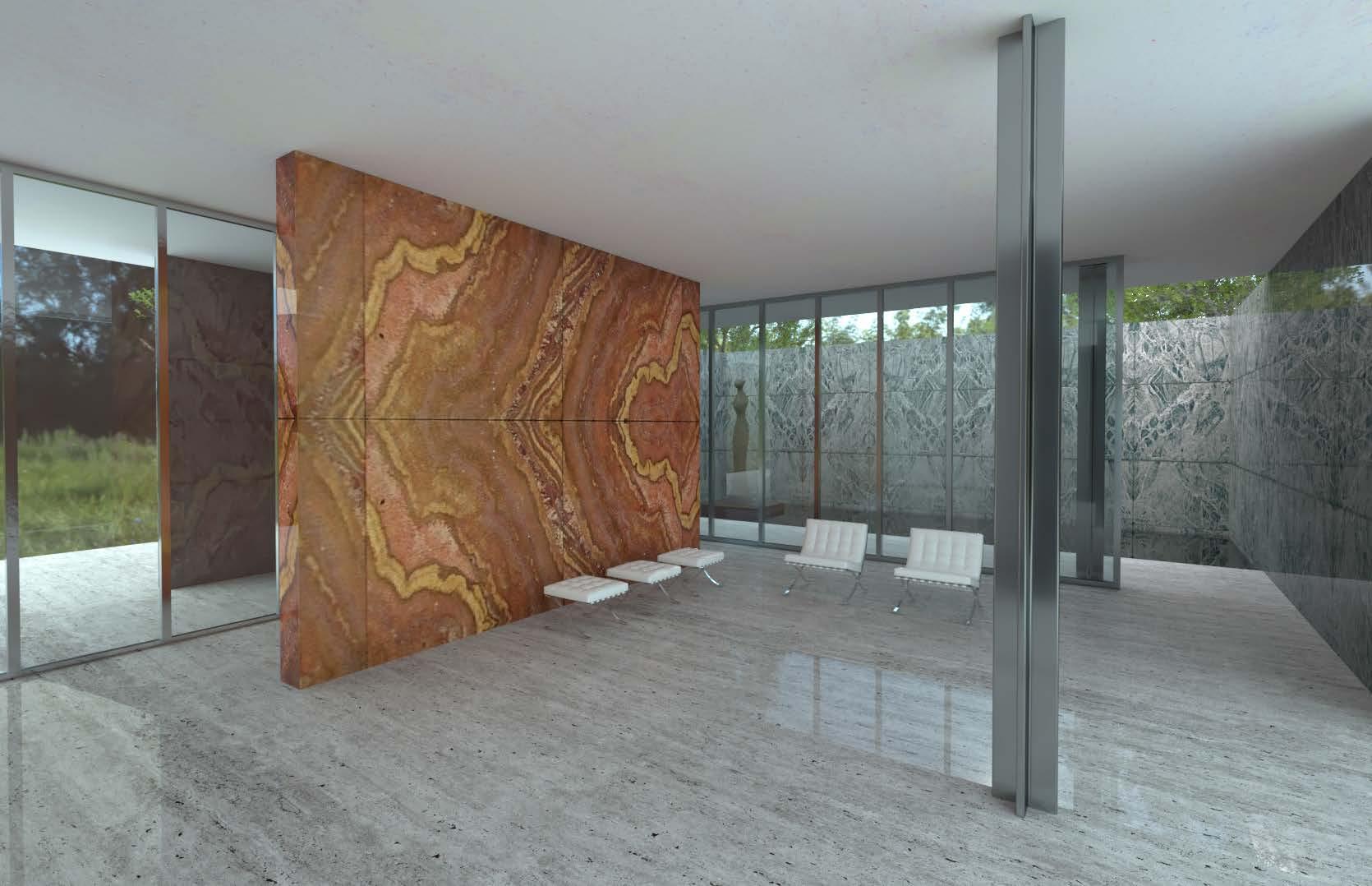 A precise digital recreation of Mies van der Rohe’s modernist masterpiece, focusing on its spatial fluidity, material elegance, and interplay of light and reflections.