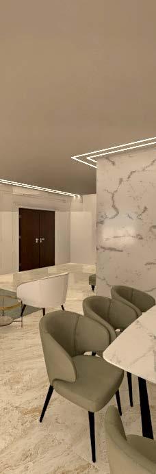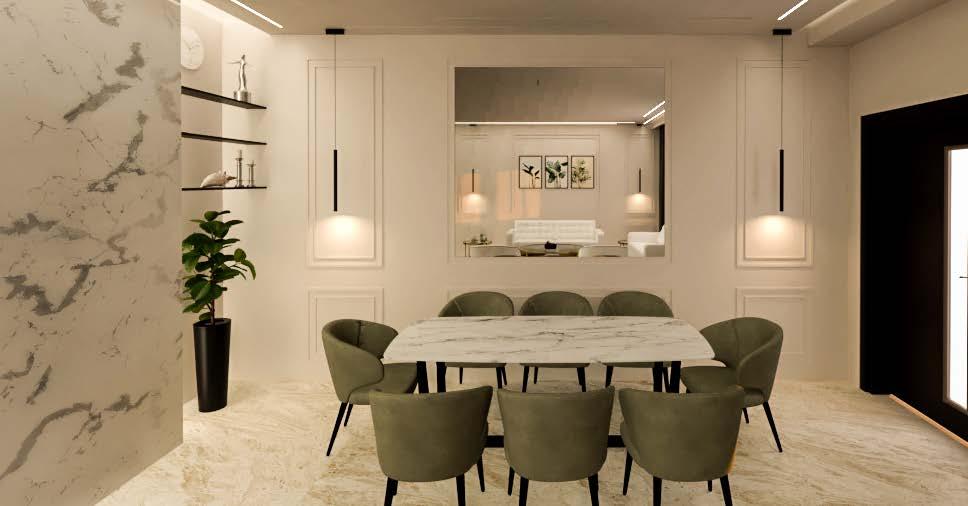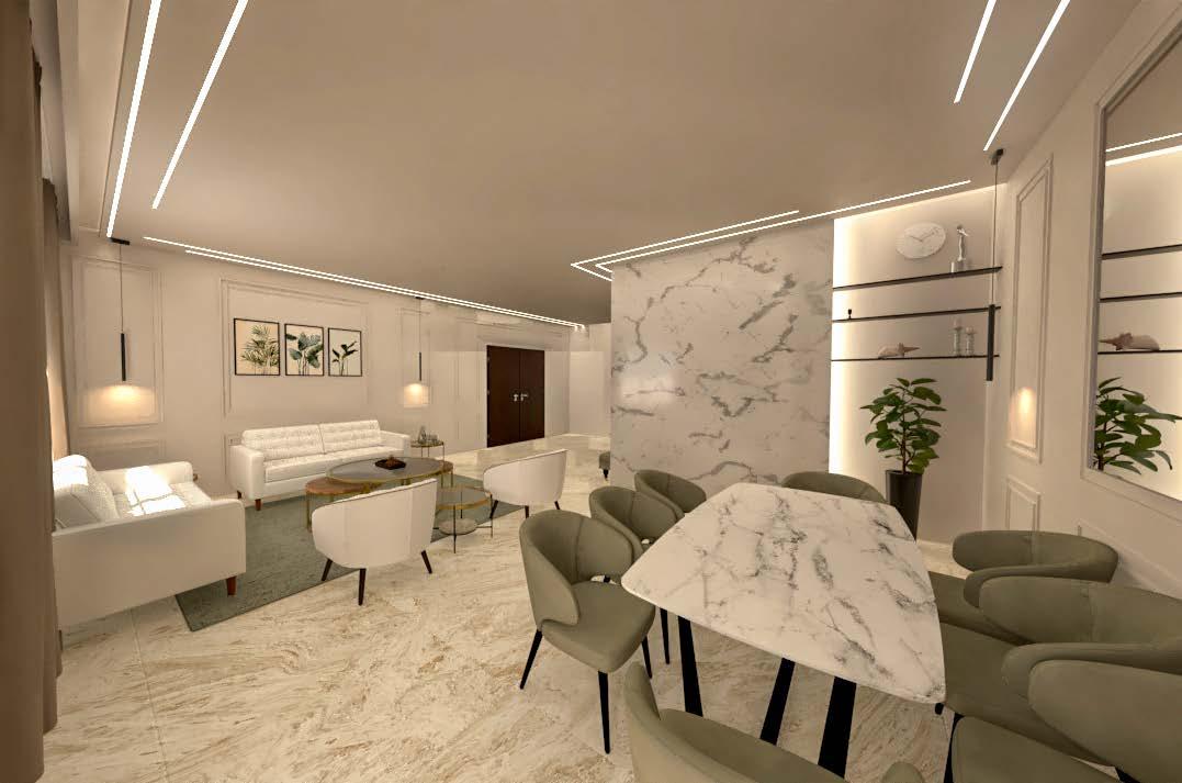 This guest room design blends modern elegance with warmth, using neutral and trendy colors, soft green tones, marble finishes, and refined lighting. The open layout enhances flow and functionality, creating a sophisticated and inviting space.