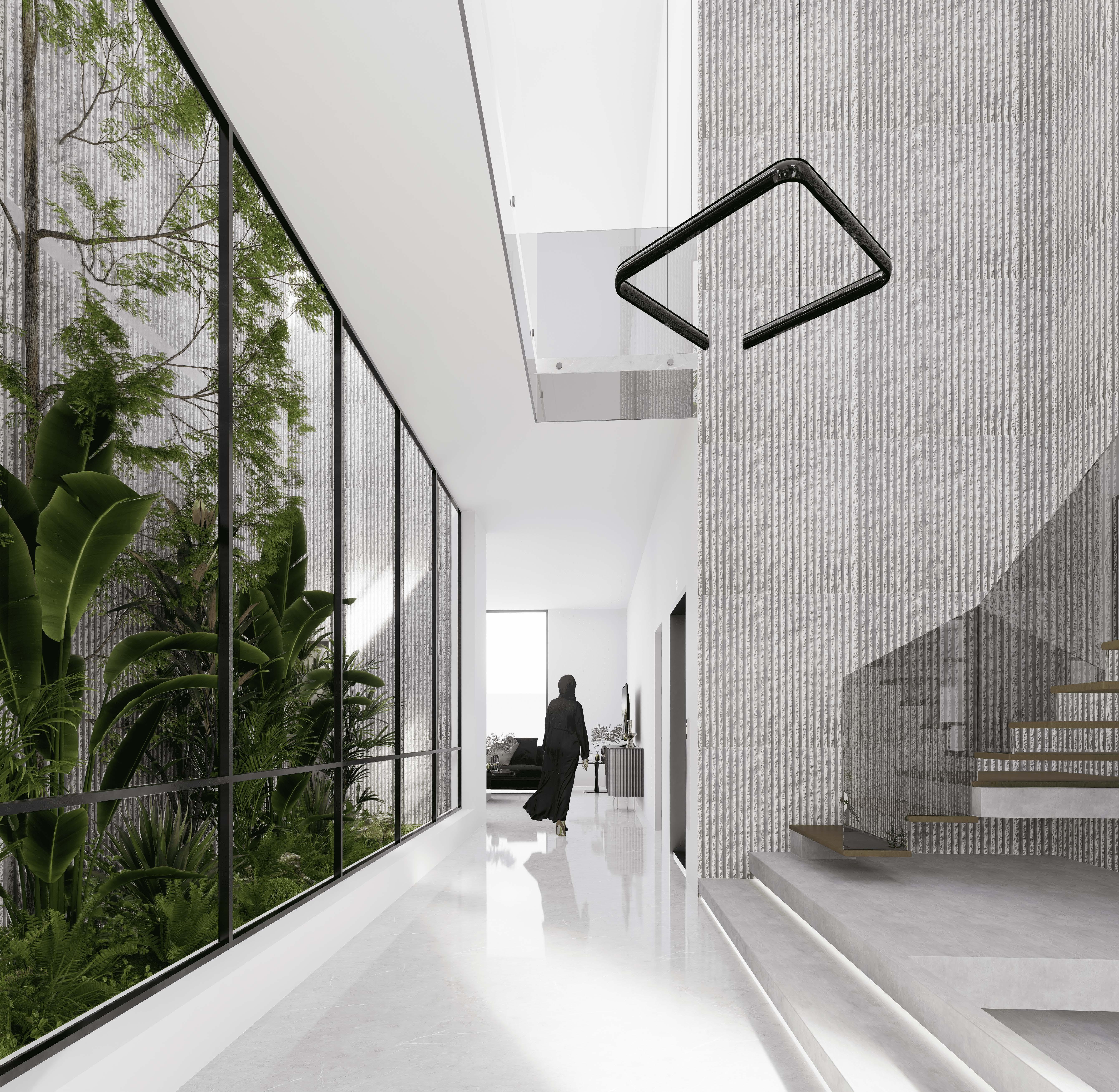 A striking feature of the villa is the central atrium, a vertical void that stretches from the ground floor up to the second level. This atrium acts as the heart of the home, a shaft of light that draws the eye upward and bathes the surrounding spaces in a warm, natural glow. It serves as a quiet reminder of the villa’s openness, creating an interplay of light and shadow that changes throughout the day.