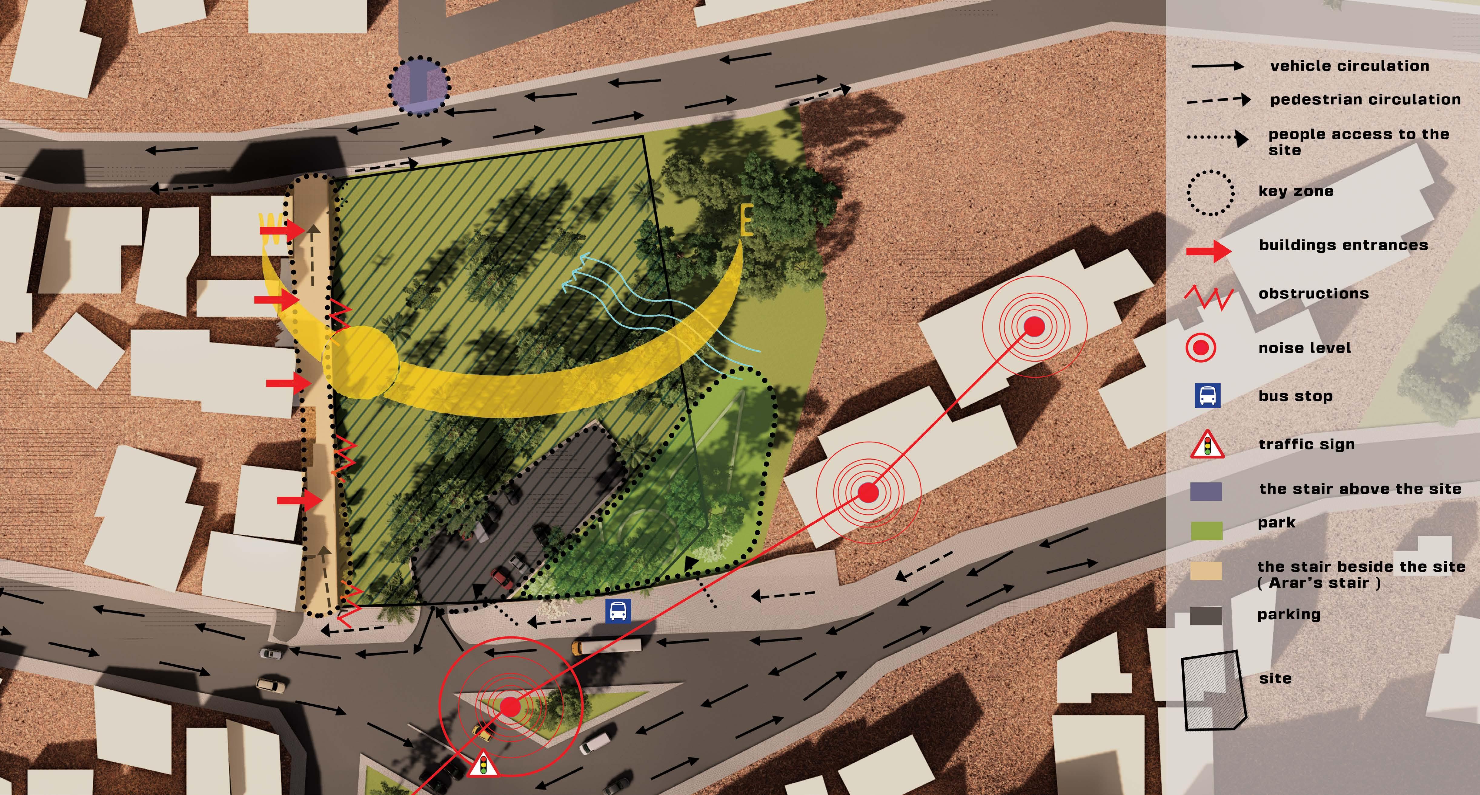 Challenges: The site’s topography and noise levels from nearby roads pose design constraints. Opportunities: Integration with Arar’s Staircase, natural landscape utilization, and enhancing community interaction.