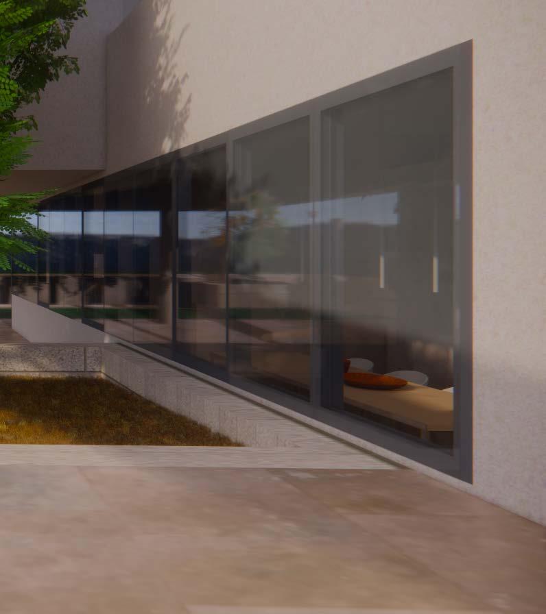 The villa’s elevation is characterized by a clean, modern and minimal design. The primary material used is rose-colored concrete, creating a unified and robust exterior. The windows are made of black, double-glazed glass, offering durability and energy efficiency while providing a sharp contrast to the concrete. This combination of materials ensures a dynamic yet minimal aesthetic, with a clear emphasis on the practical integration of structure and design. The overall approach is straightforward, with a focus on simplicity and a strong architectural presence.