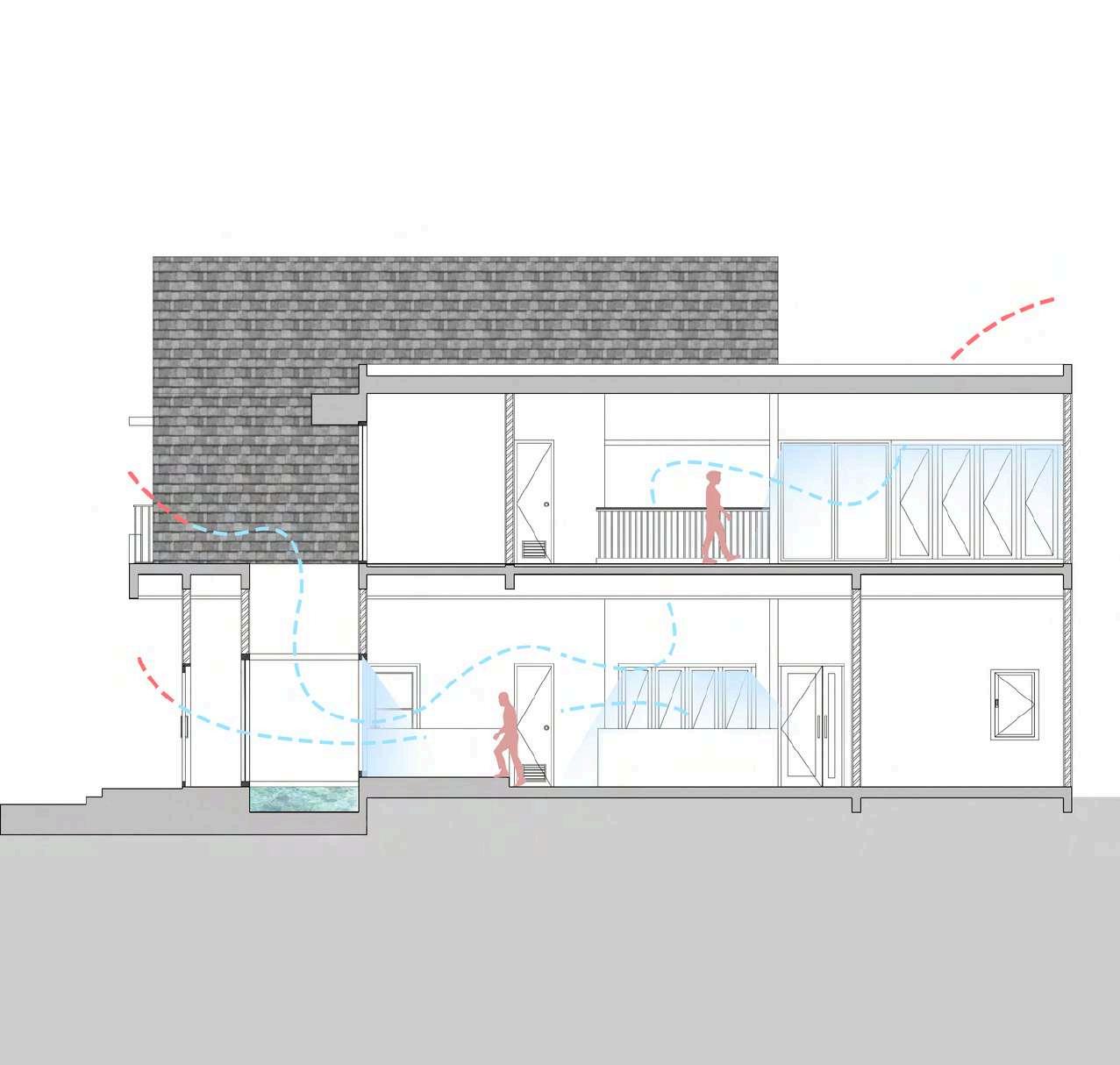 Bydesigningnecessary openings on the east and north sides of the house,itnowhascross ventilation, allowing air toflowthroughthearea from one side to anotherandcooldown indoorspaces.
