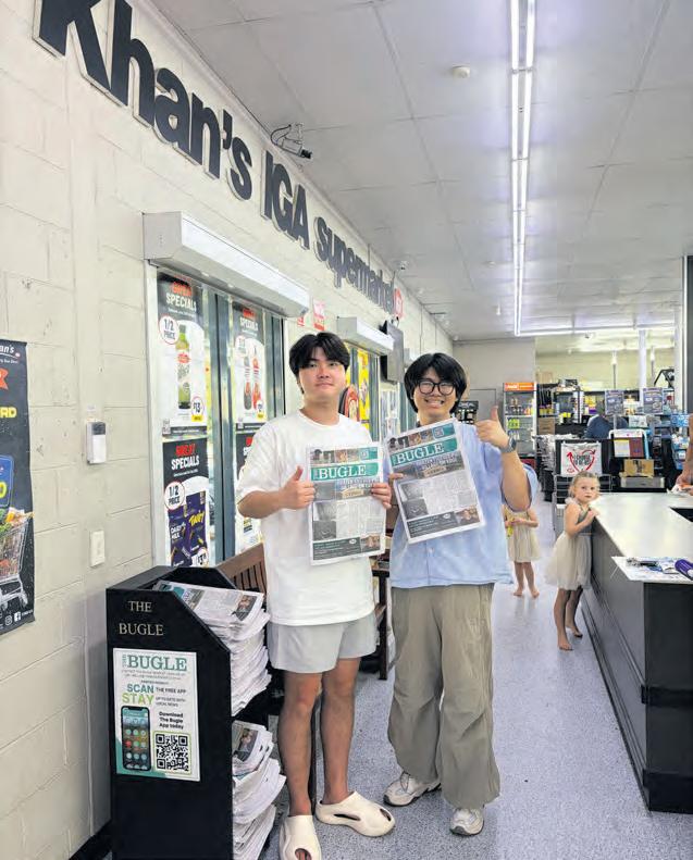 Trevor Hamblen, the retiring president of Mayflower Volunteers Inc, fellow committee members Lyn and John Rolfe, and Mena Sharpe and shop manager Jennifer James assembled for a photo outside the shop for The Bugle during the week, as did the dedicated volunteers at the sorting shed as they worked through the many donated items that needed to be arranged for sale or further distribution.