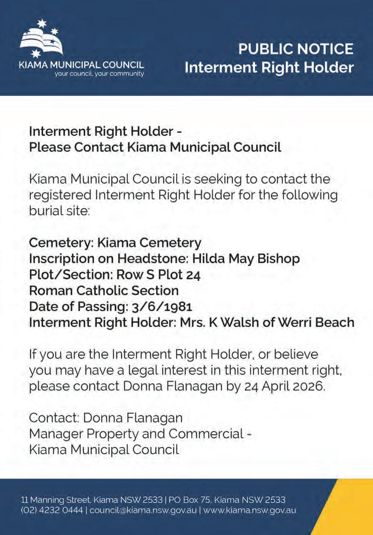 The draft policy also proposes changes at Jamberoo Cemetery, reducing the maximum number of doubledepth interment rights from four to two, due to space constraints.