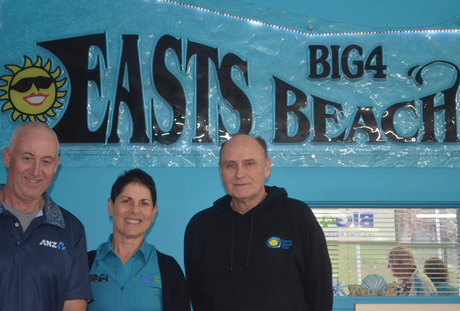 The president of the Kiama Tennis Club gathered with the sponsors of the 2024 Kiama Senior Tennis Tournament at the Kiama BIG4 East Beach Park (from left to right): Mark Simpson, Area Manager at ANZ; David Lehman and Senior Tournament coordinator; and Leanne Williams, CEO/Manager