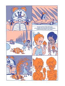 La première partie du morceau raconte la galère que peut être la recherche d’un·e amoureux·se sur les sites de rencontres, en opposition à la deuxième partie qui parle du sentiment de légèreté ressenti lors du début d’une relation amoureuse, le personnage ayant trouvé l’amour entre les deux parties. J’ai donc voulu que cette dualité soit également présente dans l’animation. Pour les deux parties, je n’ai pas vraiment fait de storyboard, j’avais les idées principales en tête, et j’ai laissé mon imagination se développer au fur et à mesure de la conception du clip. Pour la première partie, j’avais la possibilité de faire boucler certains passages, car la musique présentait des répétitions. En termes de temps, je pouvais donc faire de l’animation traditionnelle en dessinant toutes les images, technique très chronophage mais que j’aime particulièrement. La musique était très rythmée, j’ai donc essayé de caler les images sur ce rythme pour garder l’esprit très dansant de cette partie. Au niveau des éléments dessinés, je suis restée assez proche de ce qui est raconté dans les paroles, des choses très concrètes sur l’expérience de Pauline. La deuxième partie est plus vaporeuse au niveau de la musique, et plus abstraite et poétique au niveau des paroles. Je voulais exprimer ce sentiment de flottement, de lâcher-prise qu’on peut ressentir lors d’une rencontre. J ’ai donc choisi d’utiliser un logiciel d’animation qui me permettait d’avoir des mouvements plus lents et fluides que pour la première partie. C ’était aussi un moyen d’accélérer mon rythme de production des animations : j’avais cinq semaines pour réaliser un clip qui dure presque cinq minutes, un sacré défi ! Les couleurs sont également différentes. Pour la première partie, j’ai choisi une palette de couleurs très précise ; pour la deuxième, j’ai voulu créer un univers plus psychédélique, l’éventail de couleurs est beaucoup plus large.