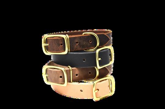 Made from 6/7 oz full-grain leather, these collars are durable, comfortable, and timeless, built to last a lifetime Featuring a solid brass buckle, D-ring, and rivets. Available in 4 sizes.