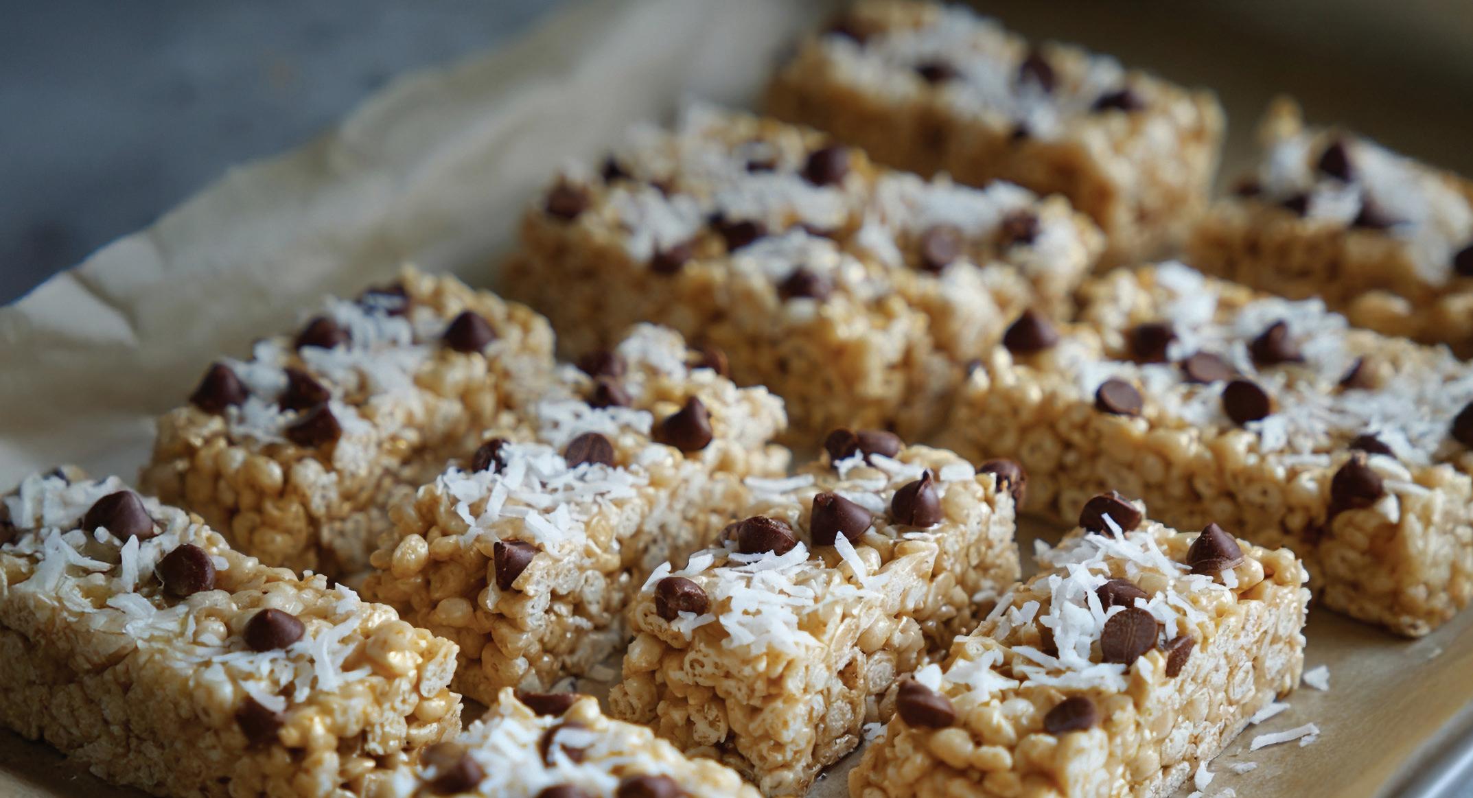 In a large bowl, combine the rolled oats, crispy rice cereal, shredded coconut, and chocolate chips.