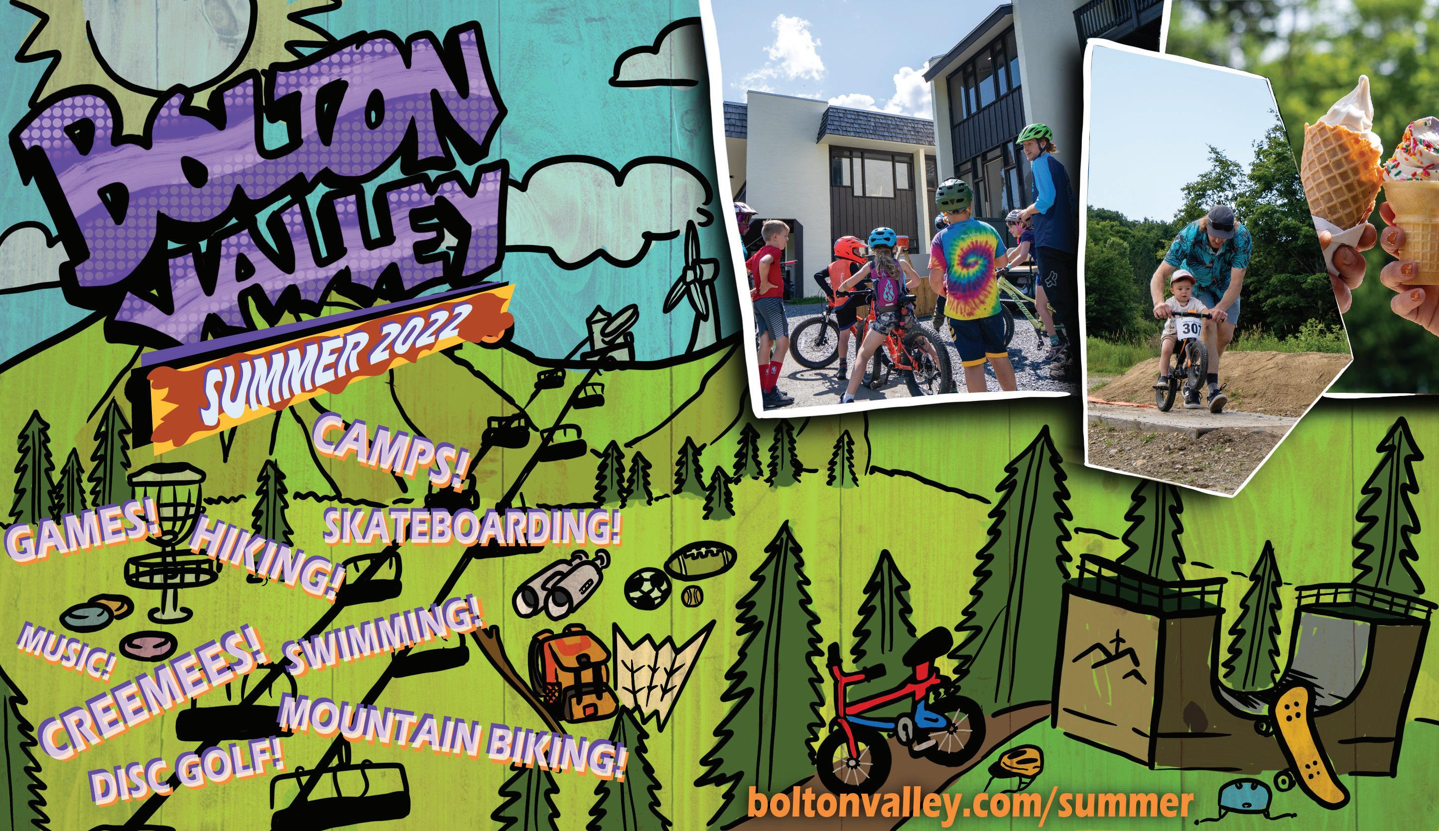 AGES: 4-17. DAY CAMP, COED. Bolton Valley Summer Camps are all about experiencing Vermont’s outdoors to its fullest. Kids who want to enjoy an adventure can join Mountain Kids Camps, where they go on hikes around the area and play games outside. For thrill seekers, there’s Mountain Bike Camp, where kids spend the day at the bike park learning from coaches. For those who would rather be inside learning new skateboard maneuvers, there’s Skate Camp. Mountain Mini’s Camp engages kids ages 4 to 6 with nature-based arts and crafts.