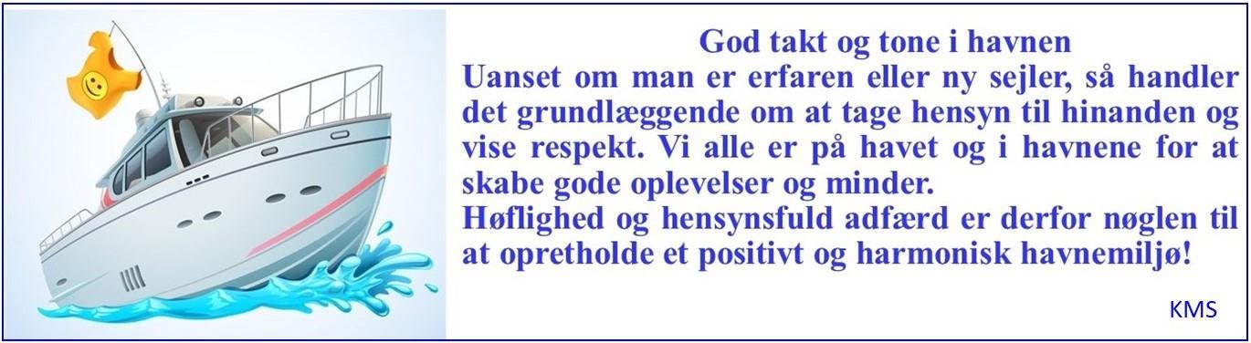 I alle danske havne og på ankerpladser er det god tone at efterleve de skrevne og uskrevne regler om takt og tone, natur og miljø. Egentlig er det meget let at være en velkommen gæst igen og igen, blot man opfører sig på samme måde, som man forventer, at andre gør. Nedenstående er et lille indspark til, hvordan vi kan respektere hverandre, når vi tager ophold i havnen: