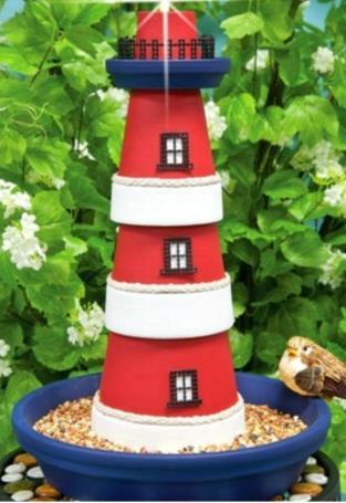 Havens fugle vil med garanti elske dette fyrtårn, som er lavet af 4 lerpotter + 2 lerskåle (til foder + top)