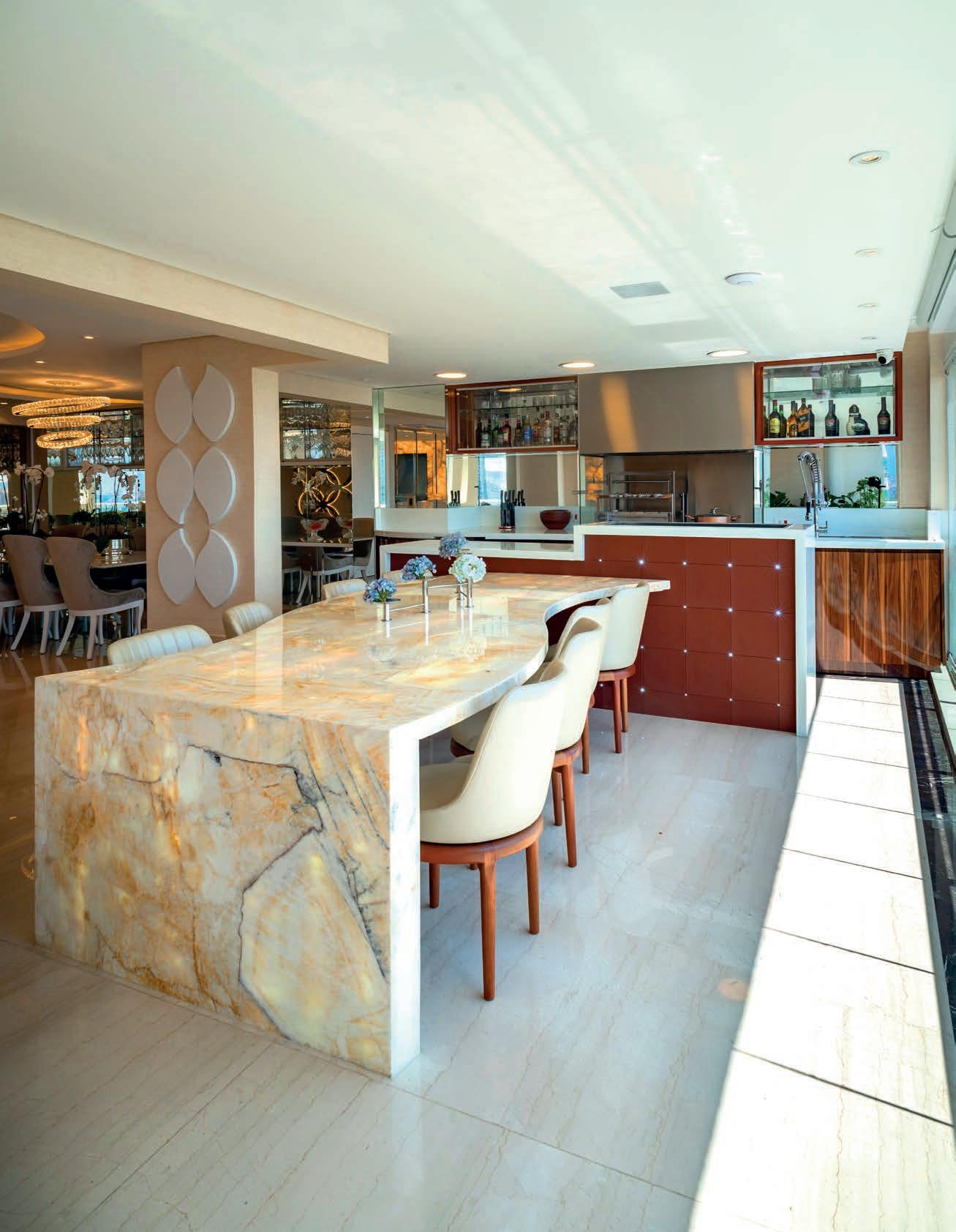 Um grande painel espelhado separa a cozinha da área social. Quando ele está totalmente aberto, os espaços ficam integrados. Mesmo compacta, ela foi idealizada com dois ambientes. De um lado a área de preparo dos alimentos e a outra de café. Entre elas, um balcão de refeições de pedra iluminada, que concebe requinte e alegria.
