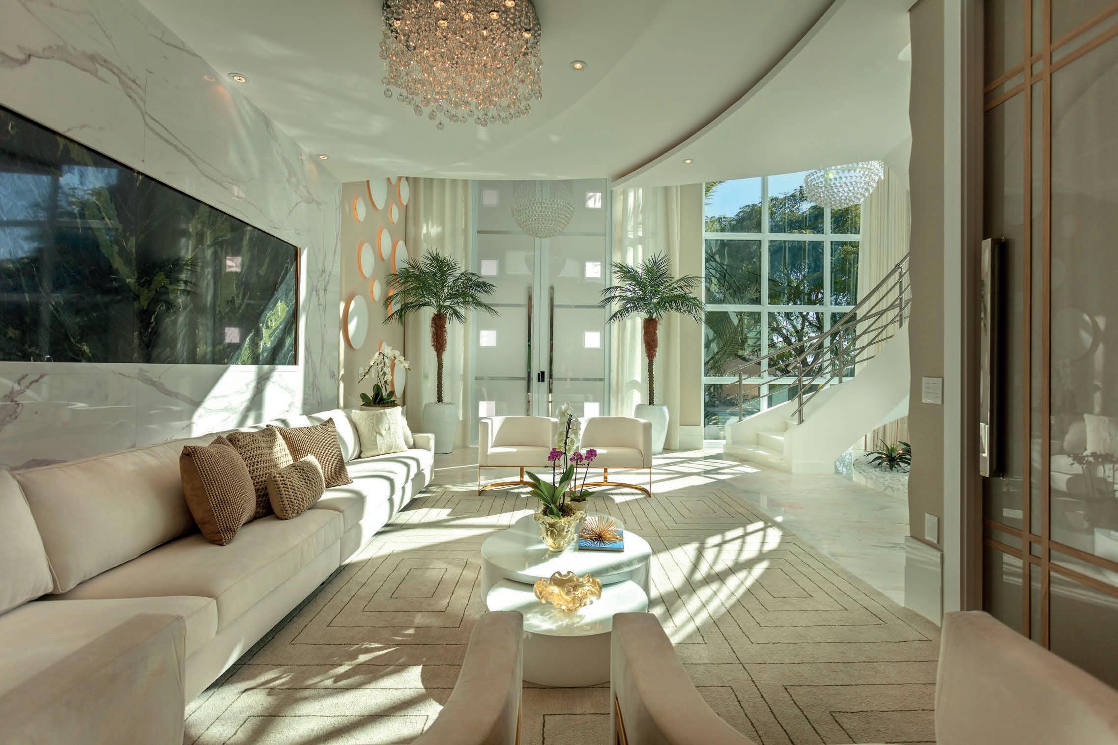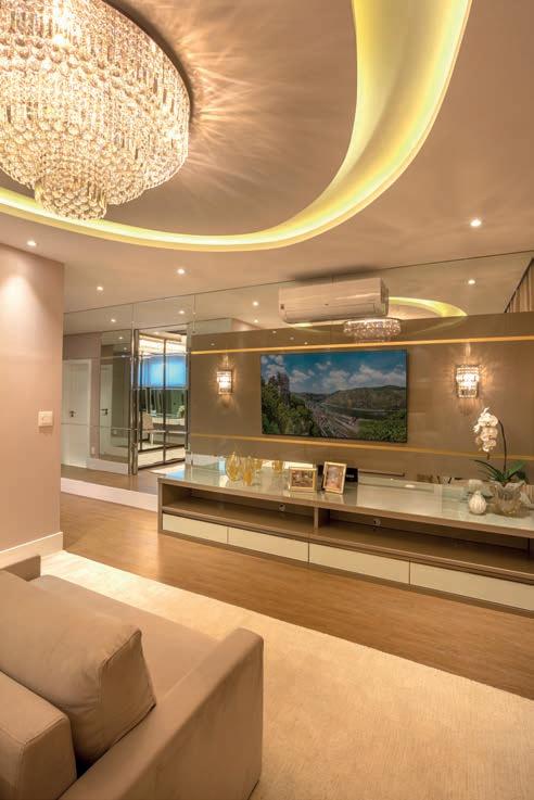 Ao entrarmos, somos recebidos por uma sala com dupla funcionalidade e altíssimos panos de vidro. Ela reúne em um mesmo espaço, a beleza do living e o aconchego da sala de TV. Um grande painel de espelho é o responsável por isolar esta sala da área gourmet, ou promover a integração total destes espaços quando estiver aberto.