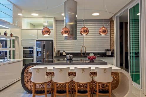 O gourmet recebeu estrutura completa, churrasqueira, pia, fogão, armários, refrigeradores e um grande cooler para encher de gelo e bebidas durante as festas. Uma mesa balcão, toda sinuosa, também compõe esse espaço.