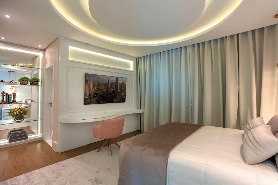 Na área íntima, uma suíte de hóspedes que também pode ser usada como escritório e a suíte máster, com closet, área exclusiva para maquiagem e uma sala de banho com banheira.