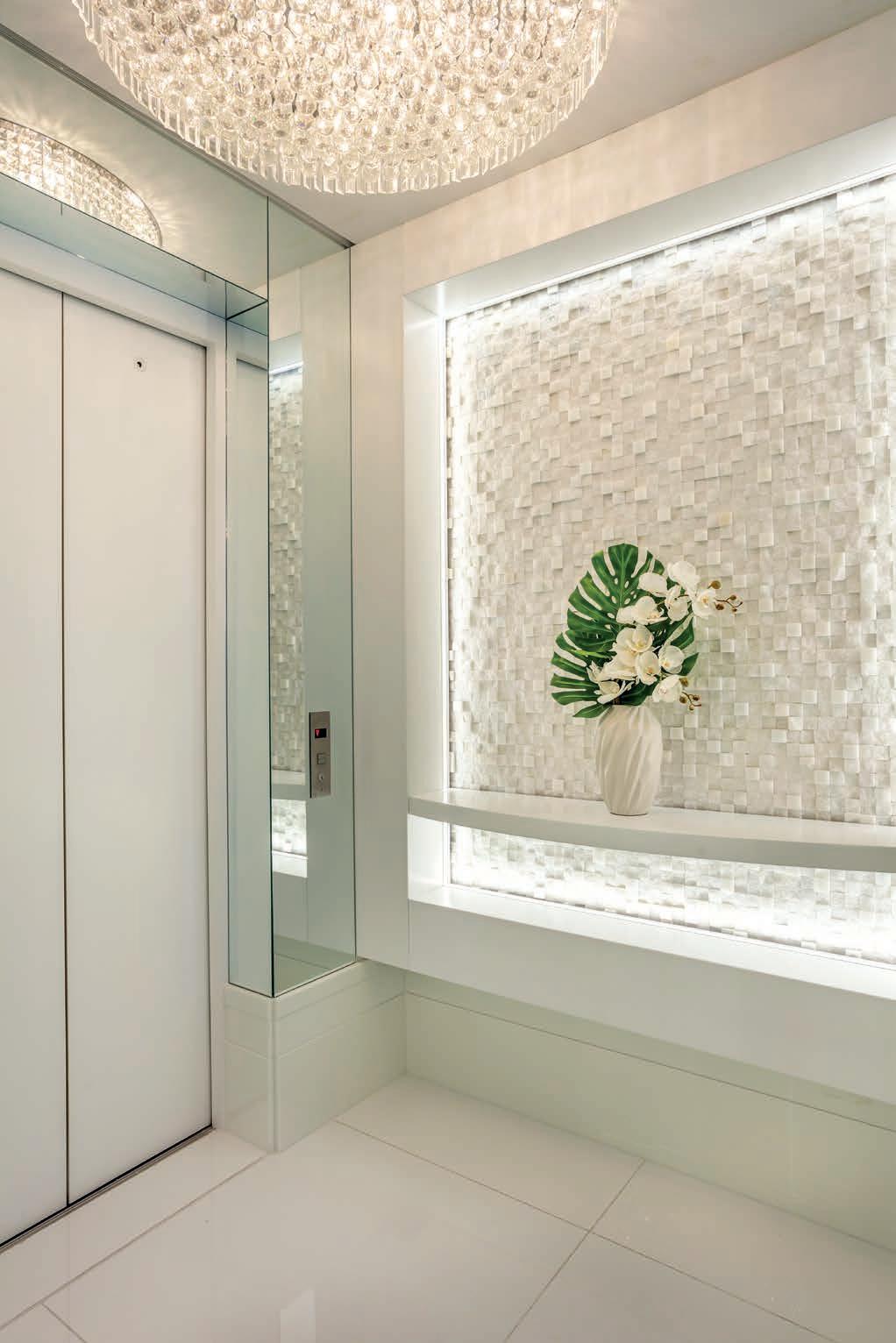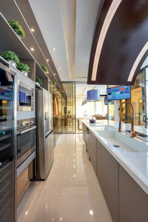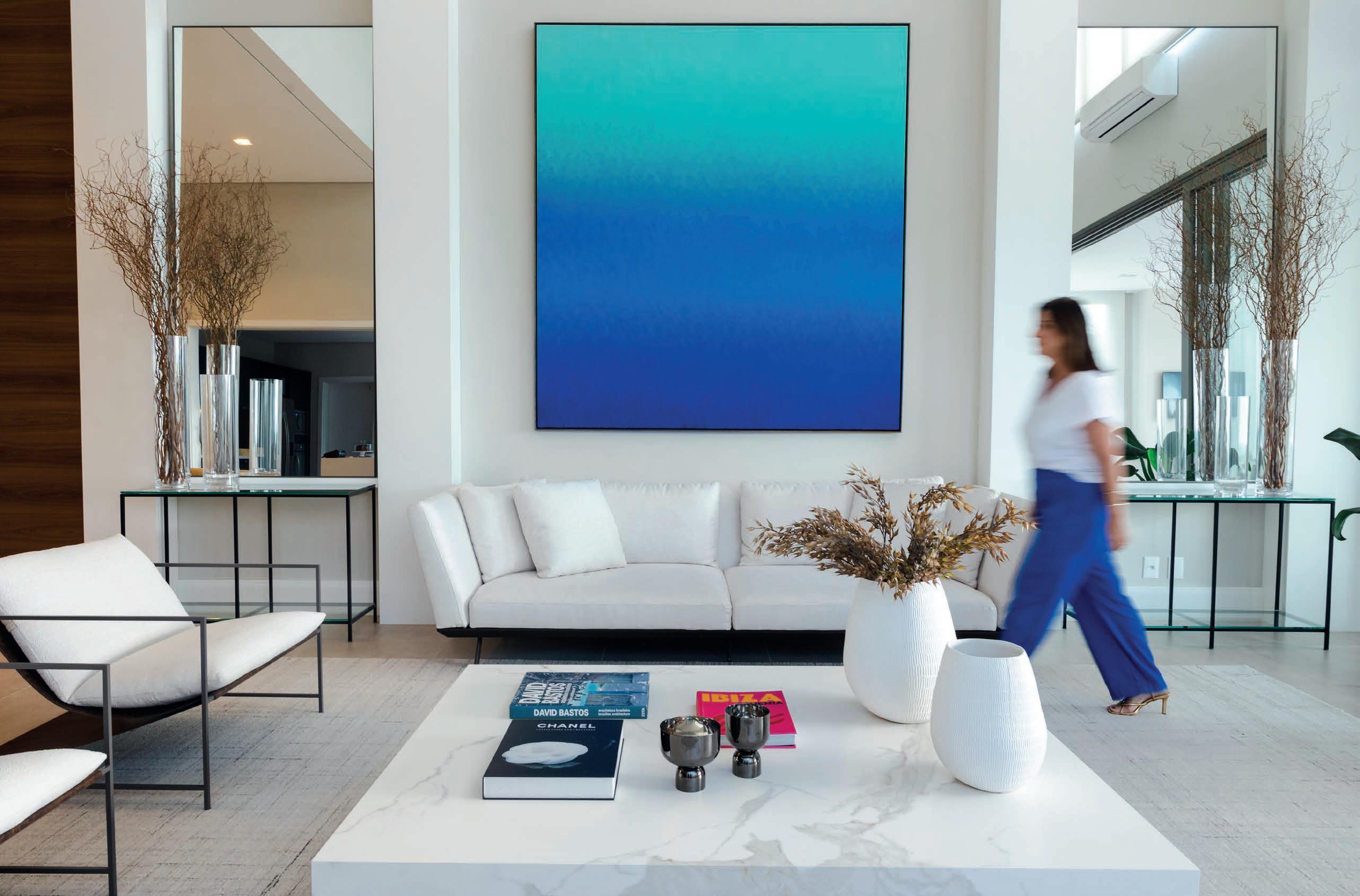 O living, que também funciona como home theater, tem painéis de mármore na parede e decoração em tons claros, azul e dourado, imprimindo ainda mais requinte ao espaço. O mobiliário superconfortável foi escolhido cuidadosamente e acolhe aqueles que usarem o espaço para assistir um filme. A charmosa cozinha, conta com painéis em espelhos, usados para aumentar a sensação de amplitude. Projetada toda em branco, possui nichos iluminados e uma grande bancada de serviço com coifa embutida acima do fogão. O ambiente contempla ainda parede viva com plantas e uma cristaleira para receber louças, taças e copos.