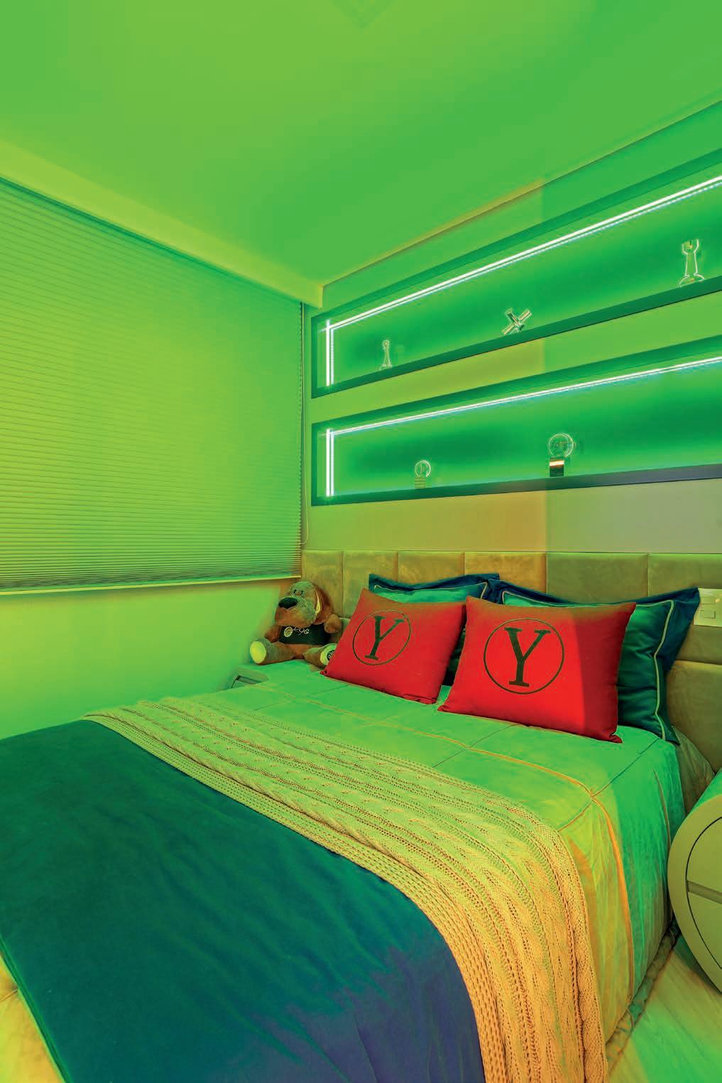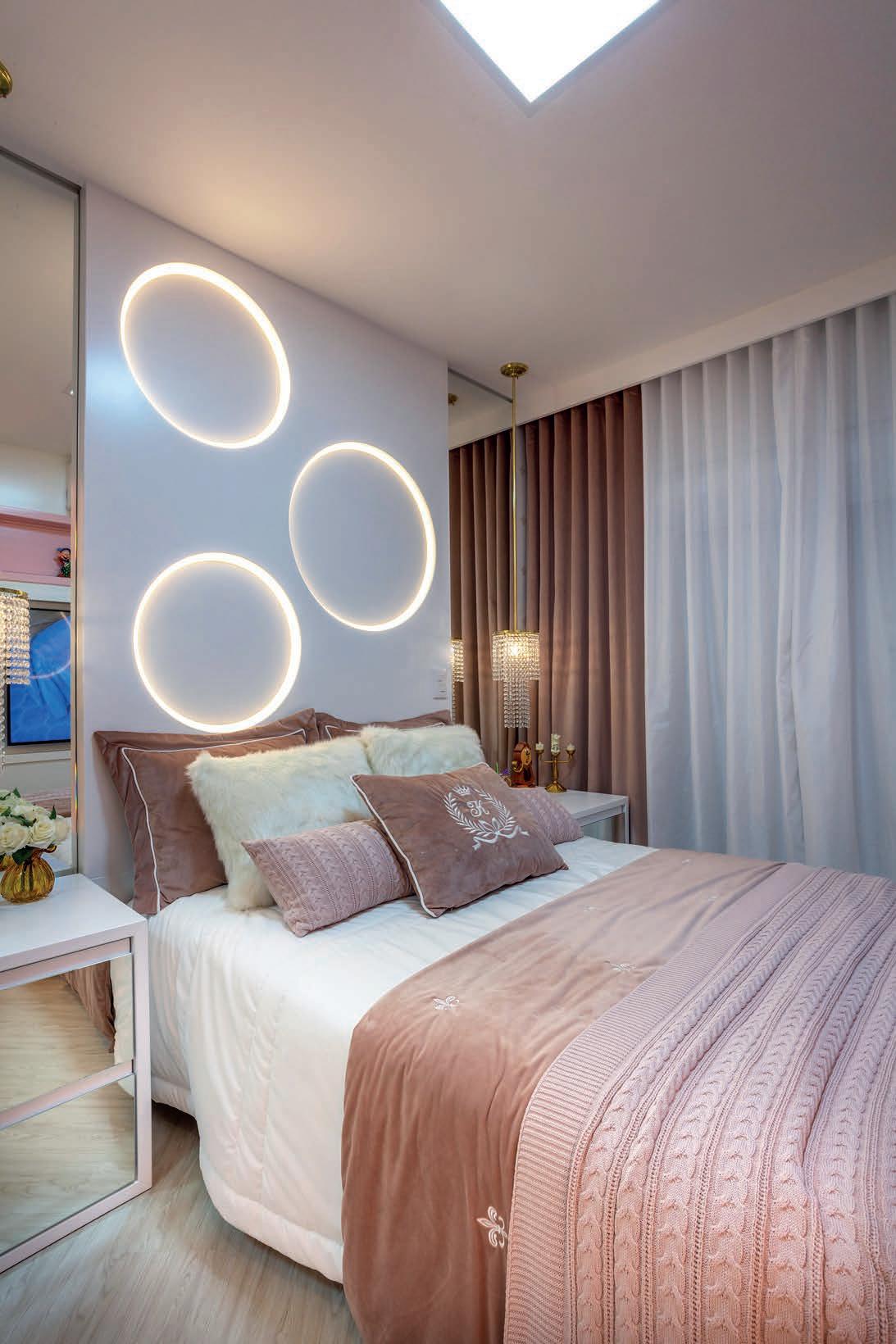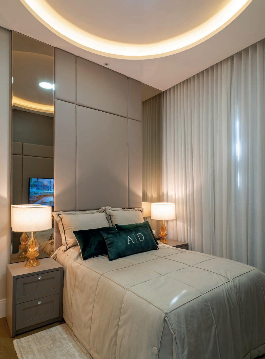 A Área íntima conta com uma brinquedoteca, quarto de hóspedes e suíte máster. A máster contempla sala de banho e closet. A cabeceira branca, que vai de fora a fora abraçando a cama e as duas cômodas, concebe imponência ao ambiente. Os frisos da parede são elementos elegantes, com ótimo custo-benefício, pois são feitos de gesso.