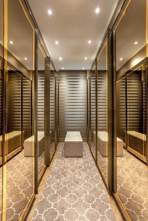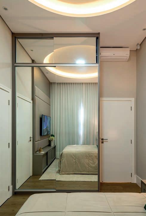 Ao entrar no imóvel, somos surpreendidos com por um suntuoso pé direito duplo e ambientes completamente integrados: living, sala de jantar e a cozinha, que foi concebida com um grande painel redondo que remete a uma luminária. Um painel de espelhos atrás da mesa de jantar, esconde uma passagem para as suítes de hóspedes e máster. A máster, toda branca com detalhes em dourado, é composta por bancada com luz camarim, chaises para leitura, closet e uma sala de banho.