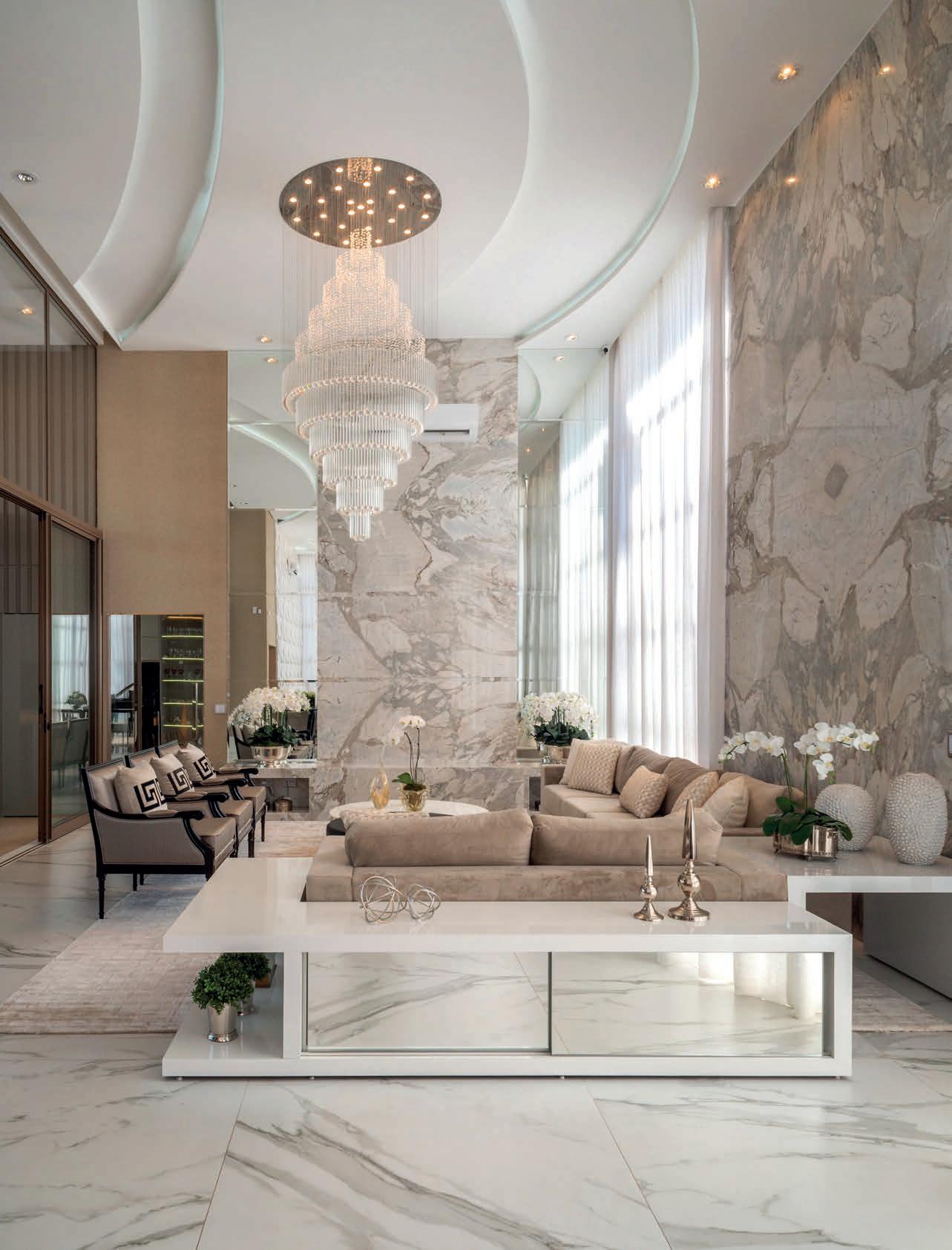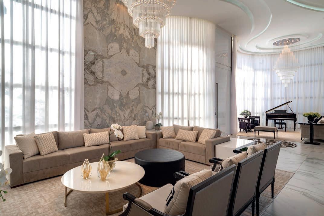 Logo na entrada, somos recebidos pela Sala do Piano, toda em branco e preto para acompanhar a elegância do instrumento musical, que é a estrela do ambiente. O suntuoso living, com painéis de mármore revestindo as paredes, complementa o estar da casa.