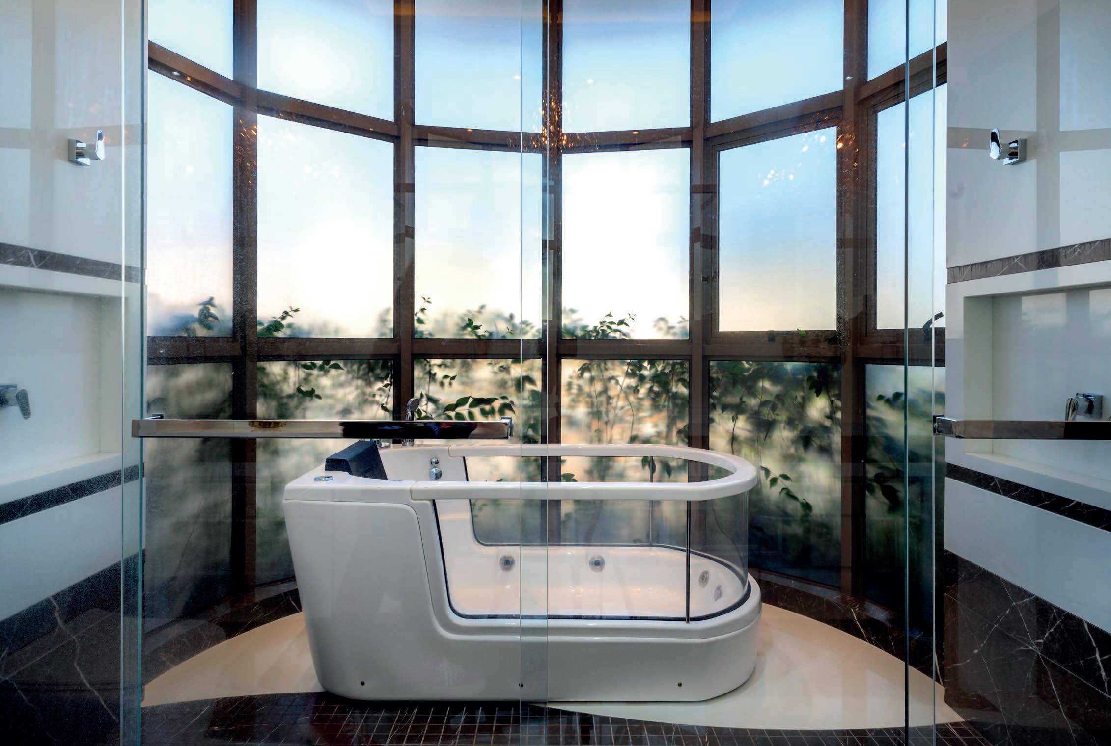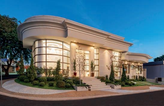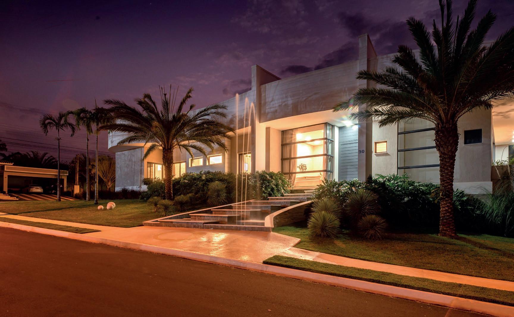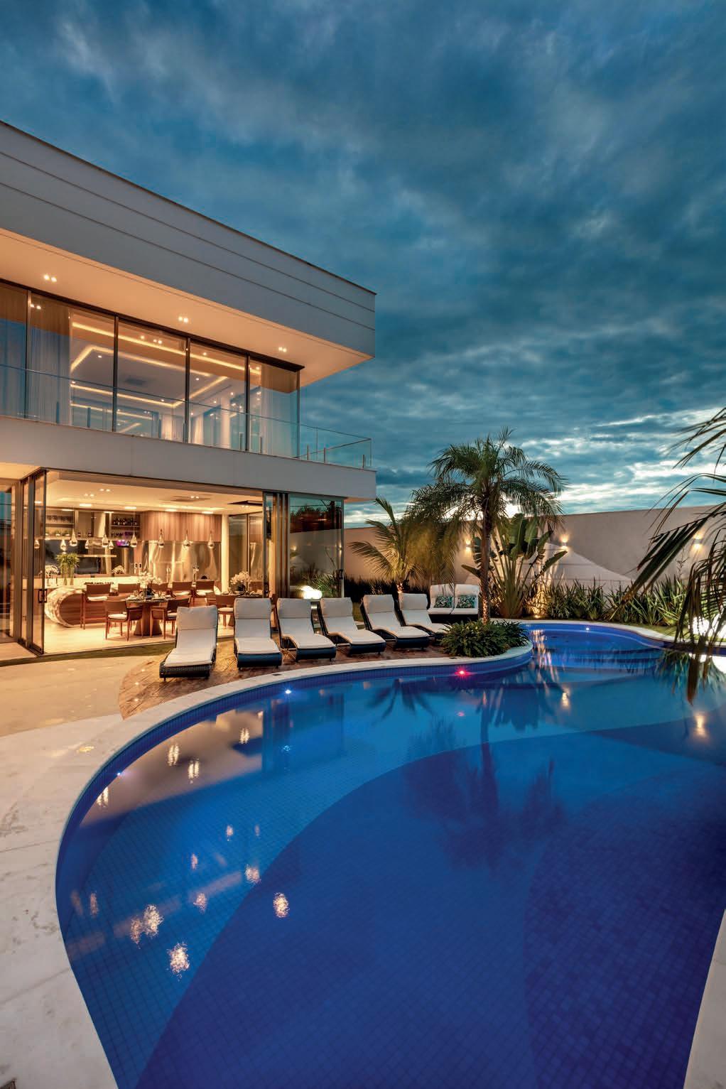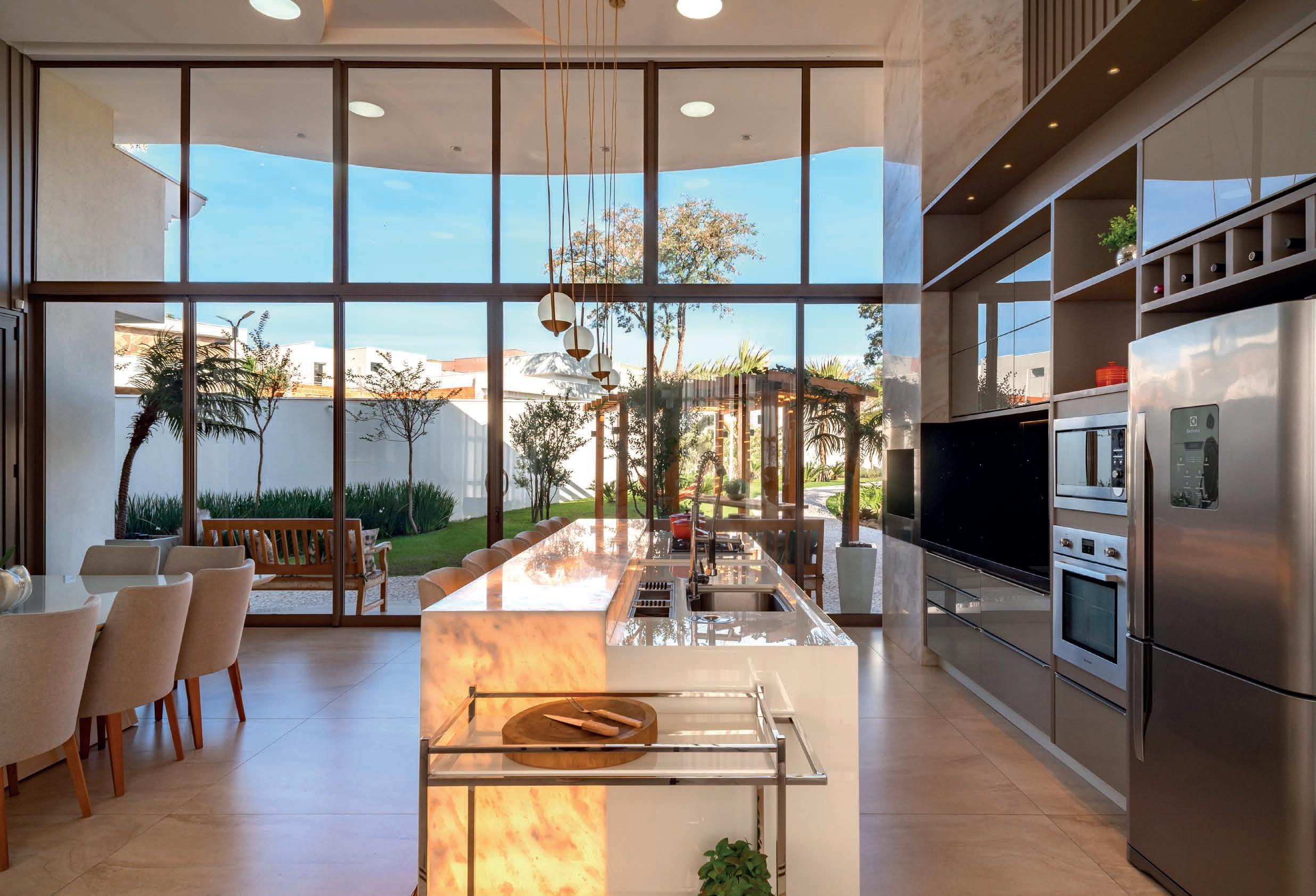 O arquiteto Aquiles Nícolas Kílaris, apostou na transparência dos vidros para promover a integração dos espaços internos e externos, transformando a área de lazer em um cenário paradisíaco para as áreas sociais como gourmet, living e jantar. Concebida em três pavimentos, o subsolo recebeu a garagem, um Studio, depósito, uma suíte com copa e acesso com elevador e escada. No térreo, a integração é total entre living e sala de jantar. O pavimento conta ainda com espaço com piano, escritório, cozinha, despensa, lavanderia, área gourmet, home theater, brinquedoteca, sauna seca, piscina, no deque da piscina, espaço com lareira e sofás. No primeiro andar está toda a área privativa, com quatro