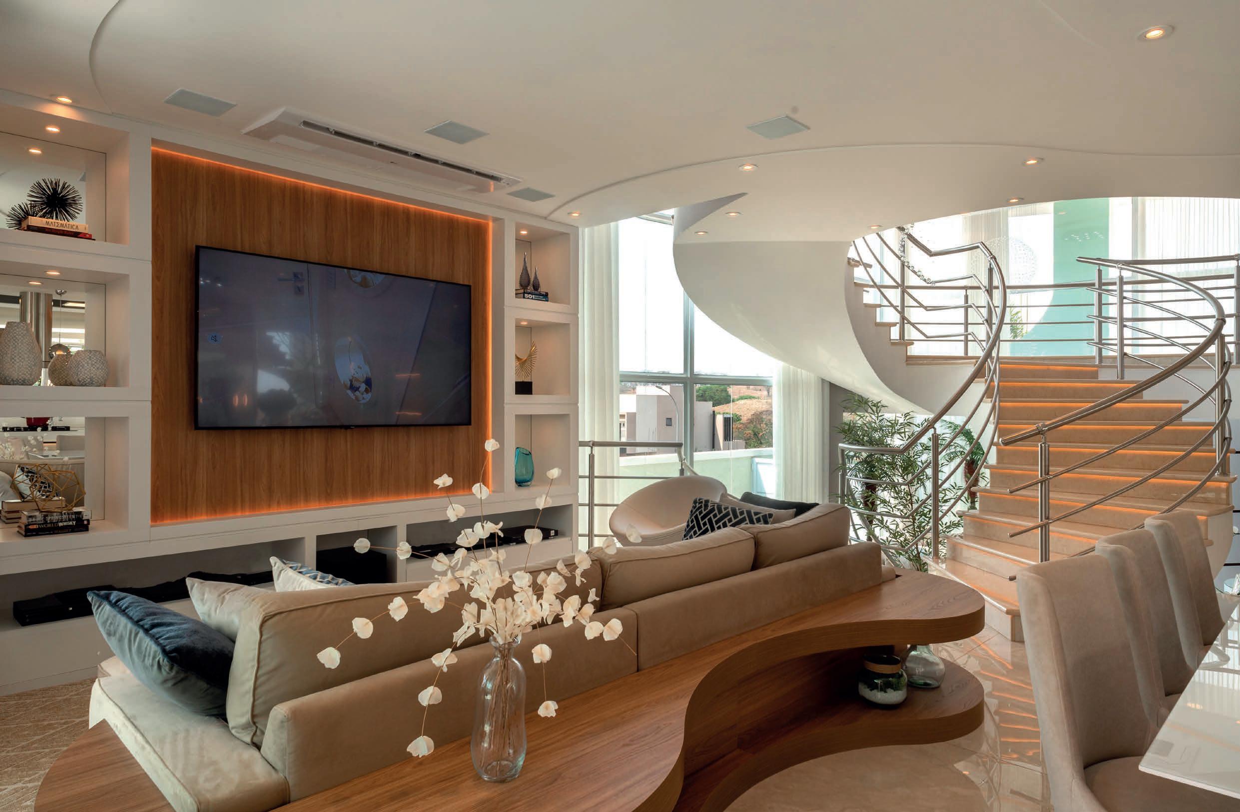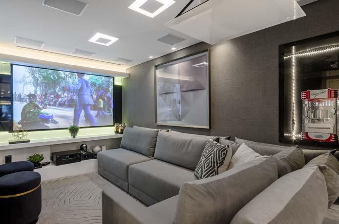 A escada, com guarda-corpo em vidro, leva a um grande mezanino onde estão localizados de forma bem integrada o escritório, sala de jogos com mesa de bilhar, lavabo, copinha de apoio e sala de cinema. Finalizando o pavimento superior, temos a suíte do gamer e um segundo quarto de hóspedes.