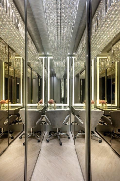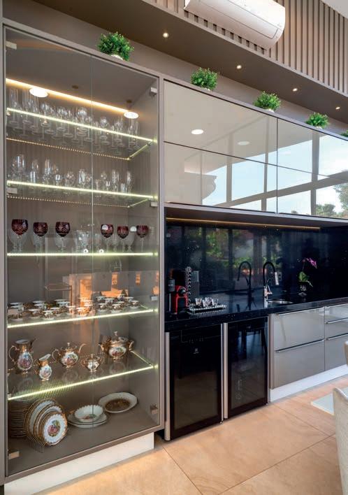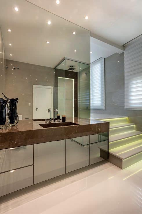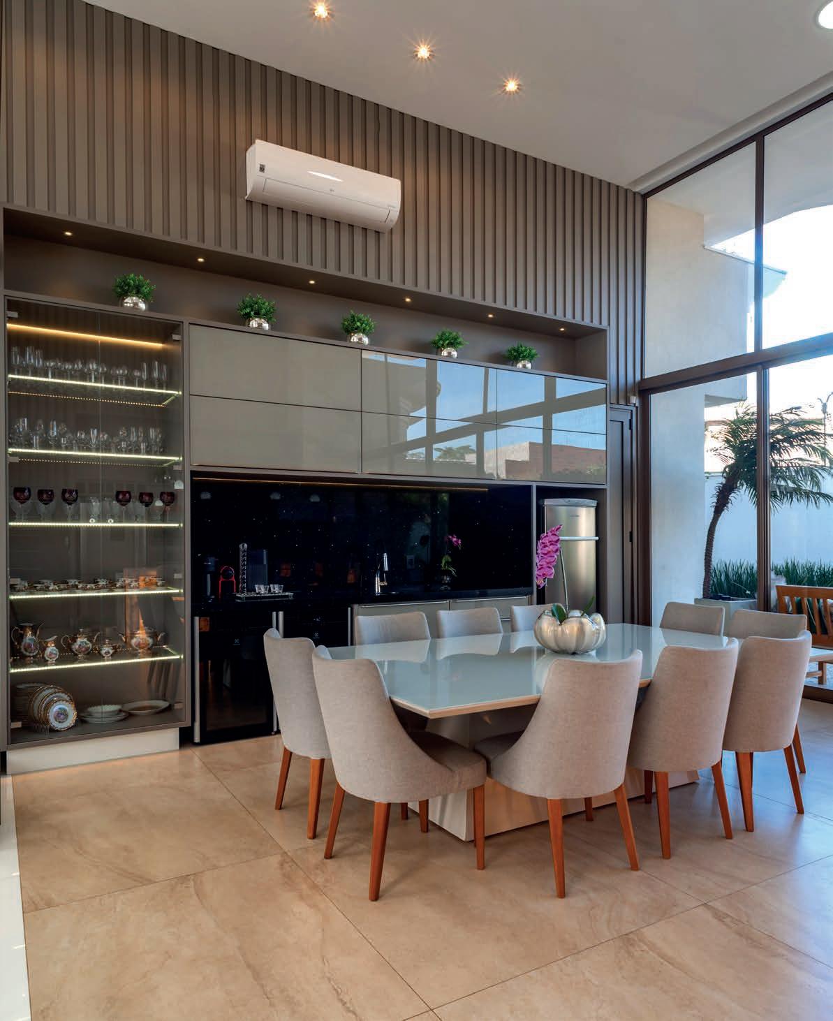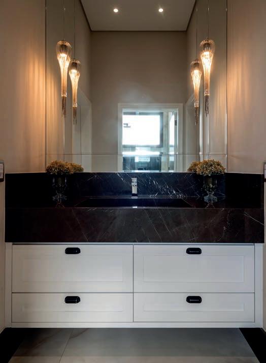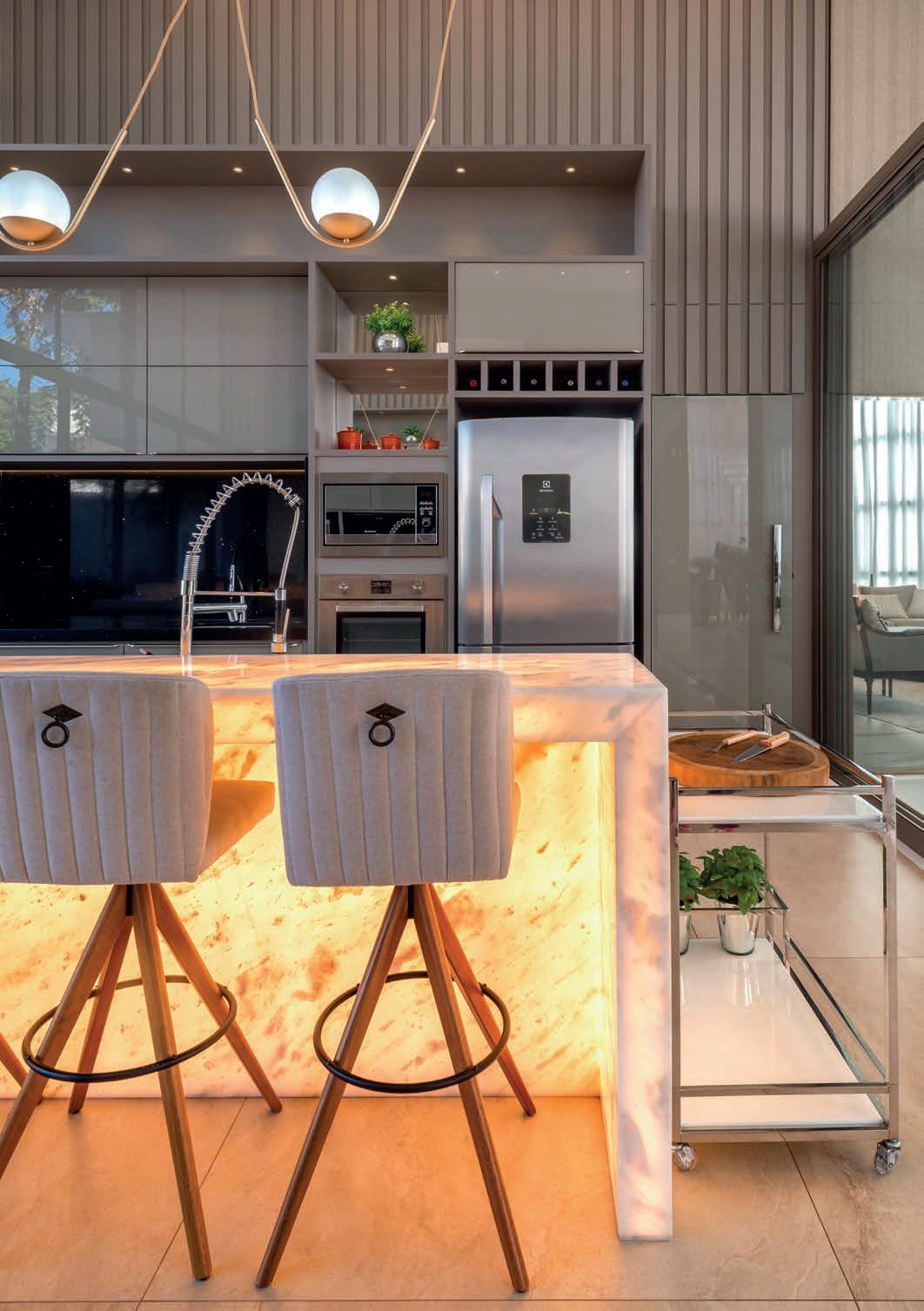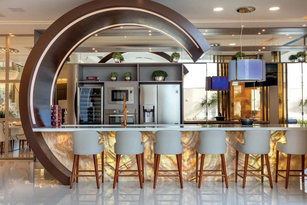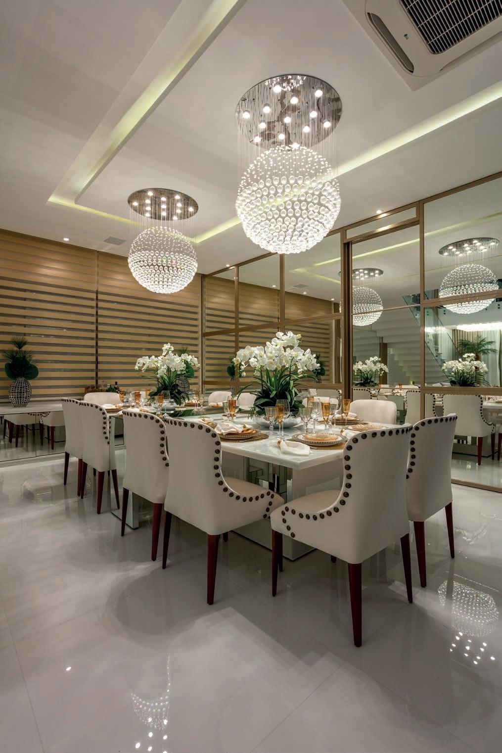 A criação do ambiente gourmet, bar/jantar, projetados lado a lado, é uma novidade e confere muita elegância ao imóvel. No gourmet, uma pequena bancada com chopeira, que pode ser utilizada para refeições rápidas, fogão e churrasqueira. Na sala de jantar, uma pedra azul iluminada acomoda uma TV. Na área social, um lavabo com teto de cristal e detalhes em dourado.