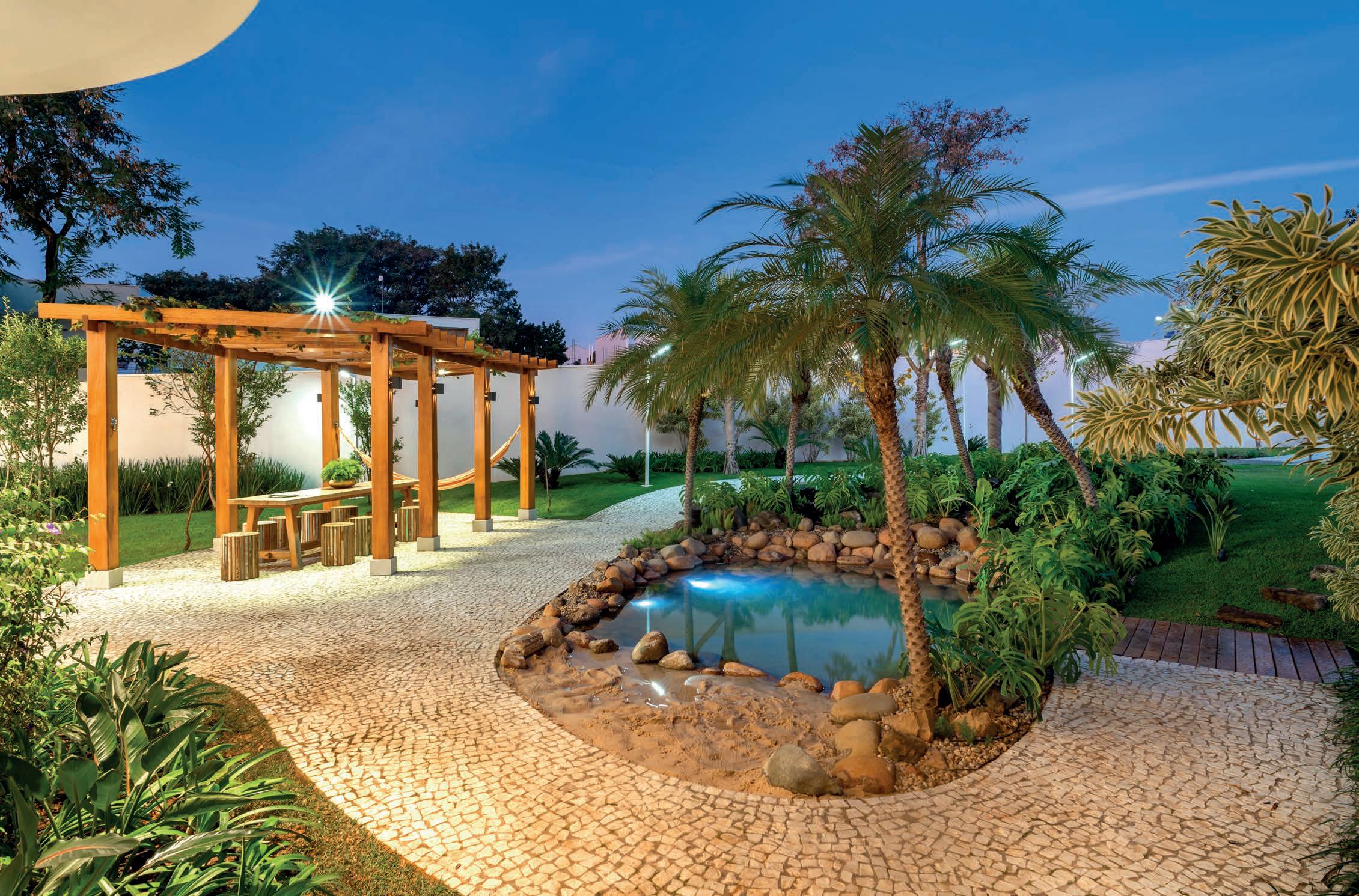 Otimizando o projeto arquitetônico, a casa ficou mais compacta e aconchegante, com bastante espaço para o jardim. A área externa é paradisíaca. O lazer possui um gazebo com uma grande mesa de madeira, espaço para rede, paisagismo tropical e um lago biológico, que pode ser usado para nadar e se refrescar. E ainda, uma horta de ervas, hortaliças e muitas árvores frutíferas.