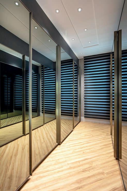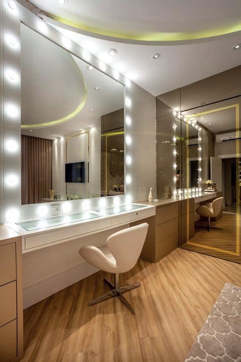 Na área íntima, um corredor com telas e esculturas, faz a distribuição para as suítes da filha, do filho e a máster. Esta última, concebida em verde e branco, com filetes dourados. No teto, com rebaixo de gesso, as tradicionais curvas Kílaris dão movimento ao espaço.