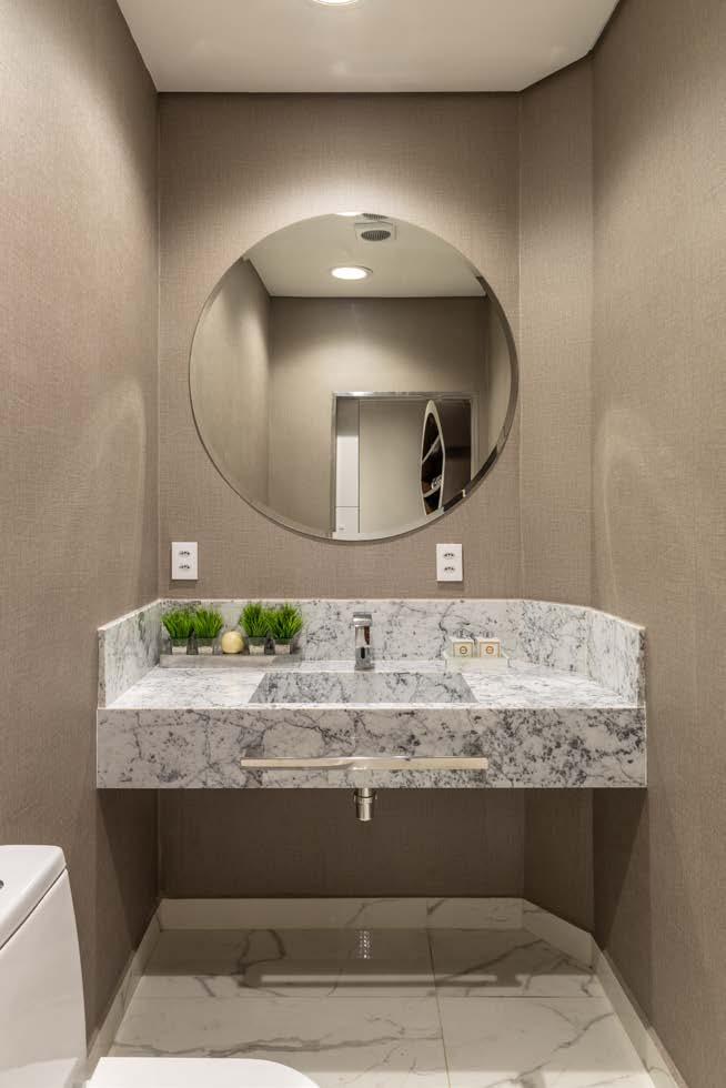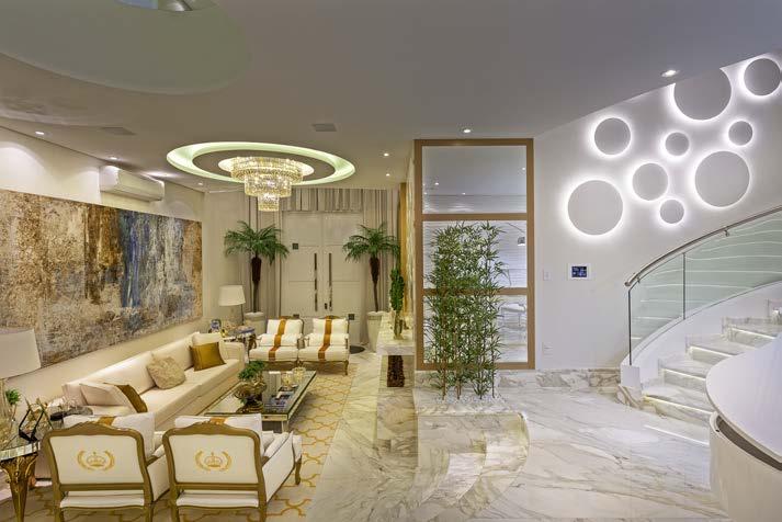 A integração dos ambientes sociais, torna tudo mais amplo. O living com lareira, é composto por um grande sofá com linhas curvas “Kílaris”, o que concebe movimento e beleza ao espaço. Painéis em madeira com esculturas trazem acolhimento. A decoração moderna ganhou pitadas de elementos clássicos, como a grande mesa de jantar espelhada. A cozinha gourmet é completa e conta com balcão de refeições e até churrasqueira. Uma sala multiuso, usada como escritório ou descanso é responsável pela transição da área social para a área íntima das três suítes. A máster, toda branca e dourada é elegante e conta até com uma saleta particular, onde é possível tomar café ou trabalhar.