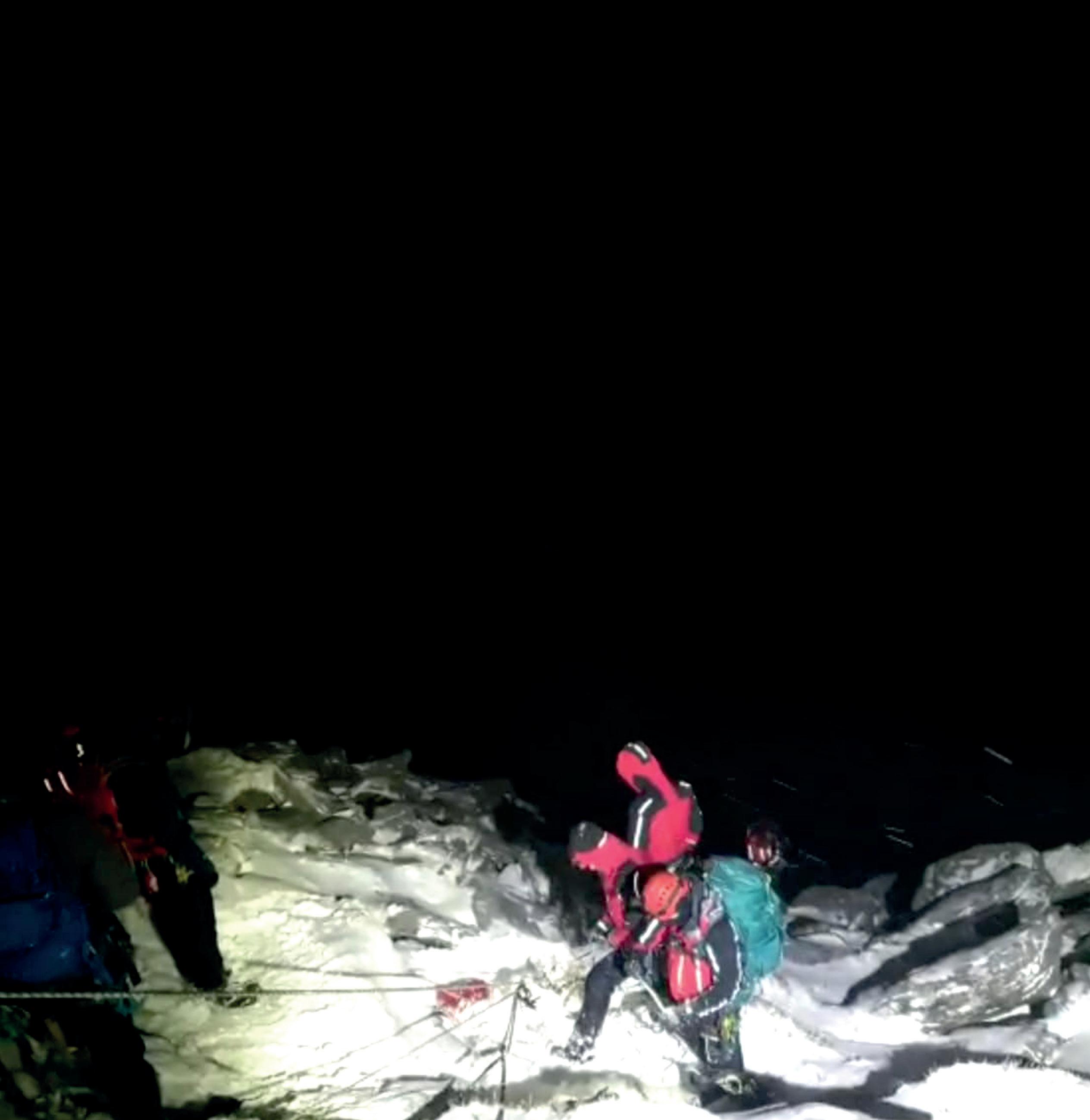 Two experienced hill runners dressed in shorts and t-shirts with head torches passed the rescue operation on their way to the top and later made it down safely.