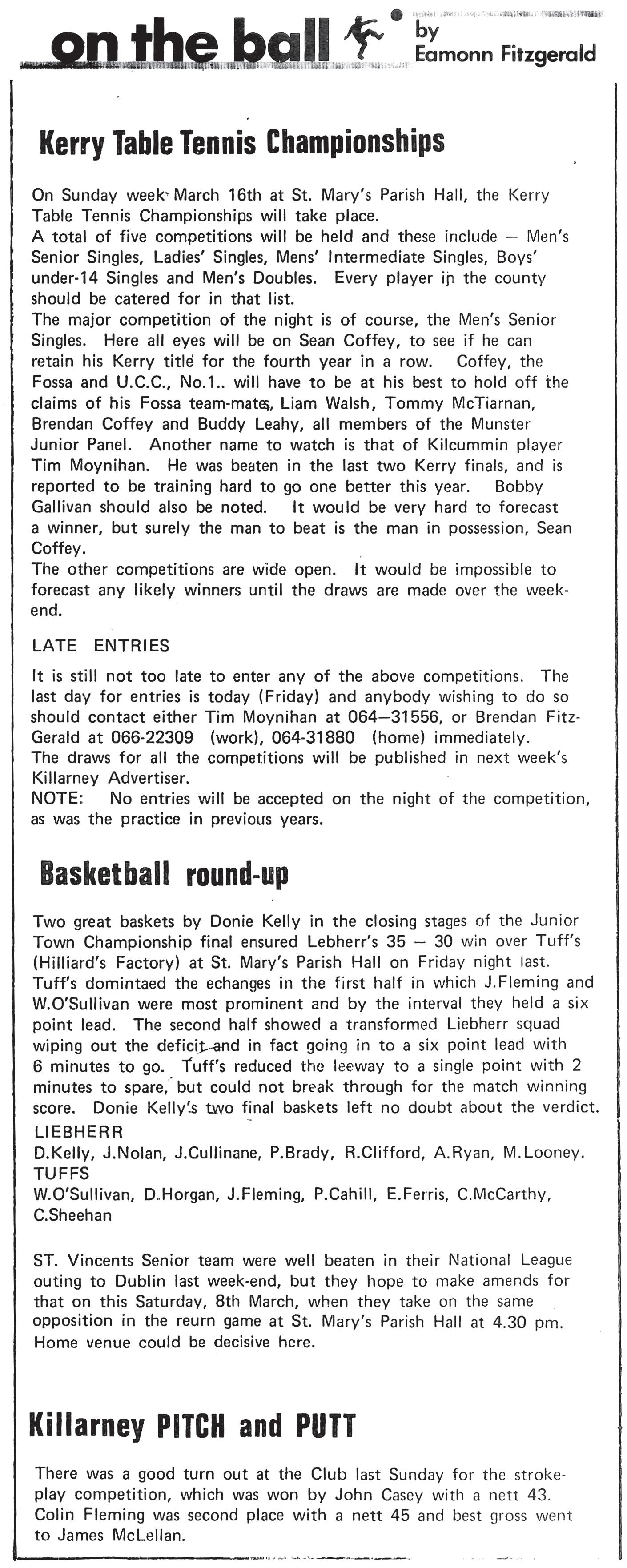 LISTRY COISTE NA NÓG: Quiz night in Faha Court on Friday, March 31. We are looking for volunteers and spot prizes on the night. For all enquiries, please contact Mark Curran.