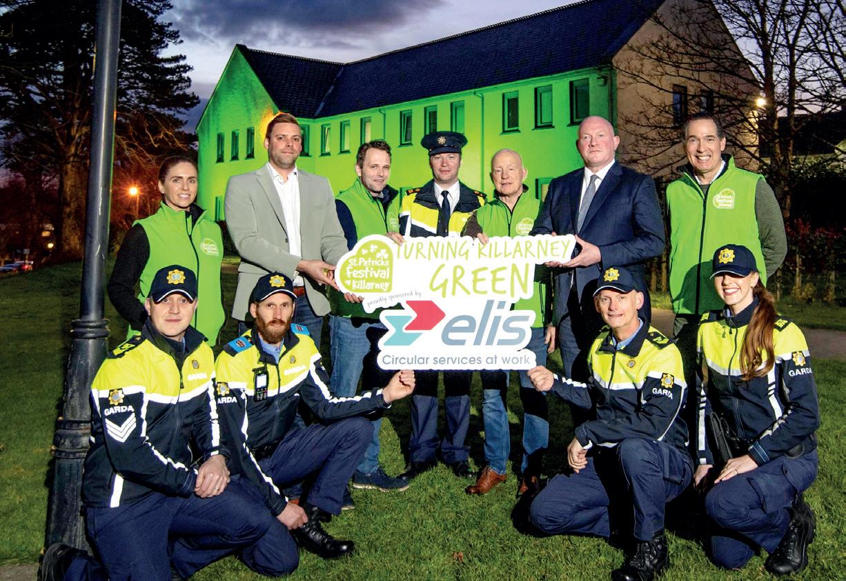 Chief Superintendent John Ryan joined Festival Chairman Jason Clifford, Elis Textiles Interim CEO Eoin Collins, and Andrew Trigg for the switch-on. Also present at the ceremony were Johnny McGuire, Chairman of Killarney Chamber, festival members Ciara Austin and Jonathan Aber, and Killarney Gardai Sgt. Kieran McElligott, Garda Luke Burgeons, Garda Leanne Haussmann, and Sgt. Dermot O'Connell.
