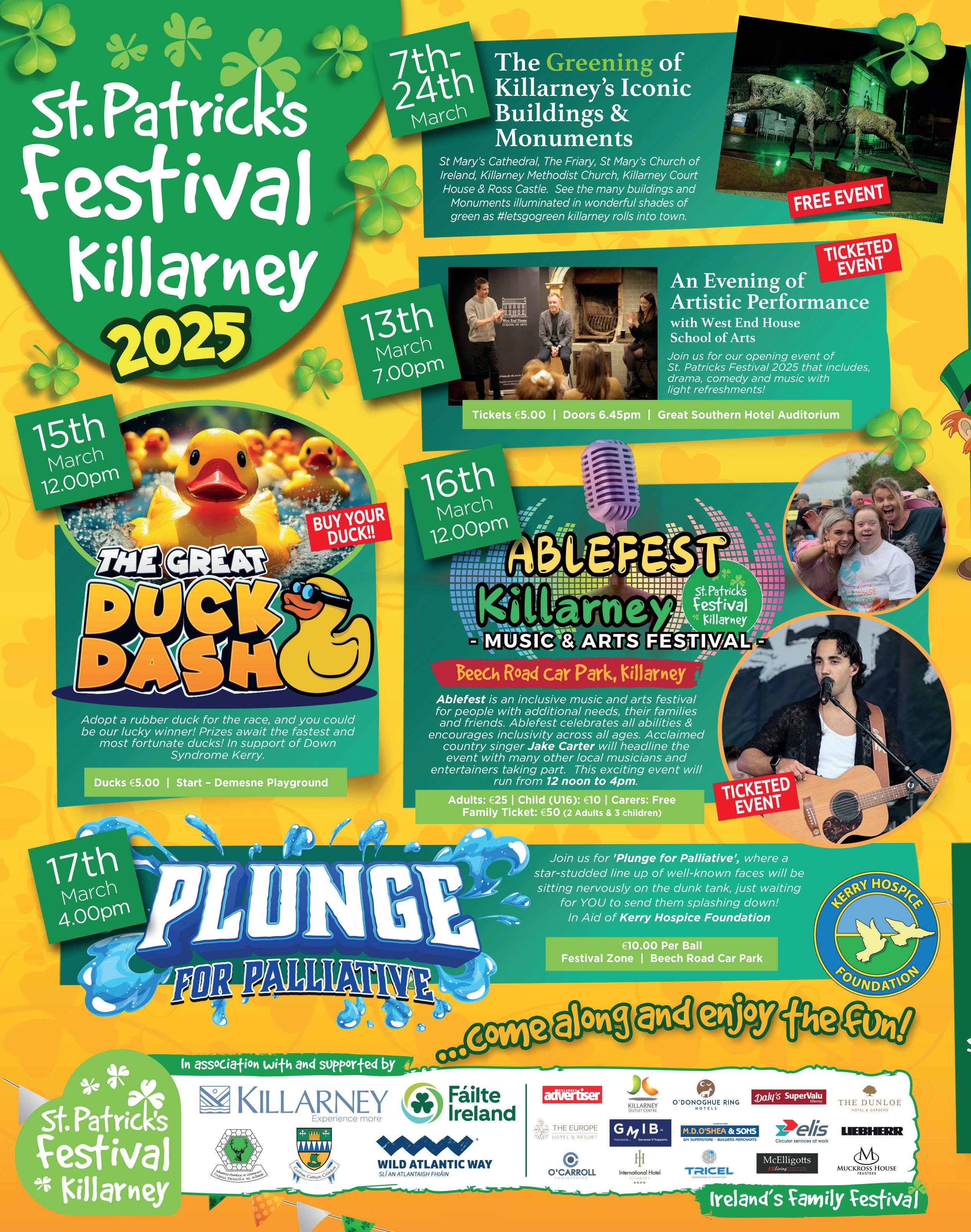Join us on the 15th March at 12noon for our Duck Dash on the Deenagh in aid of Down Syndrome Kerry. We are also delighted to introduce AbleFest for the very first time on March 16th—an inclusive arts and music festival designed for everyone, with a focus on people with diverse needs. To mark the occasion, Beech Road Car Park will be transformed into a dedicated festival zone