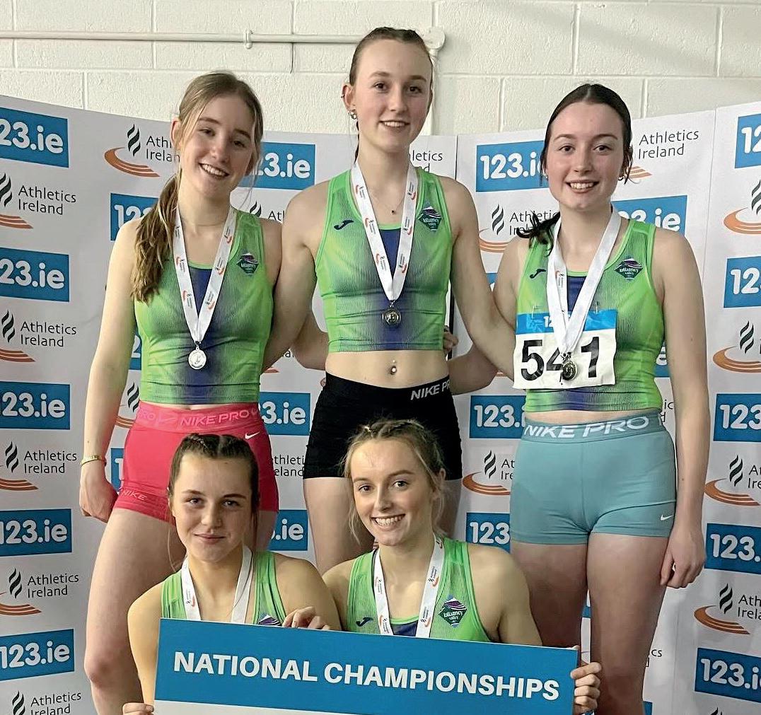 NATIONALS: The National U20 & U23 Indoor Championships were held in Athlone last Sunday. The Team of Mollie O’Riordan, Megan O’Reilly, Sophie Duke, Tara O’Sullivan and Madie O’Riordan got a silver medal in the U20 4x400m relay, smashing the club record by 2 seconds crossing the line in 4.13.50! Jack O’Leary battled through 2 rounds of the U23 800m and executed a perfect tactical race to claim Bronze in a time of 1.55.18.