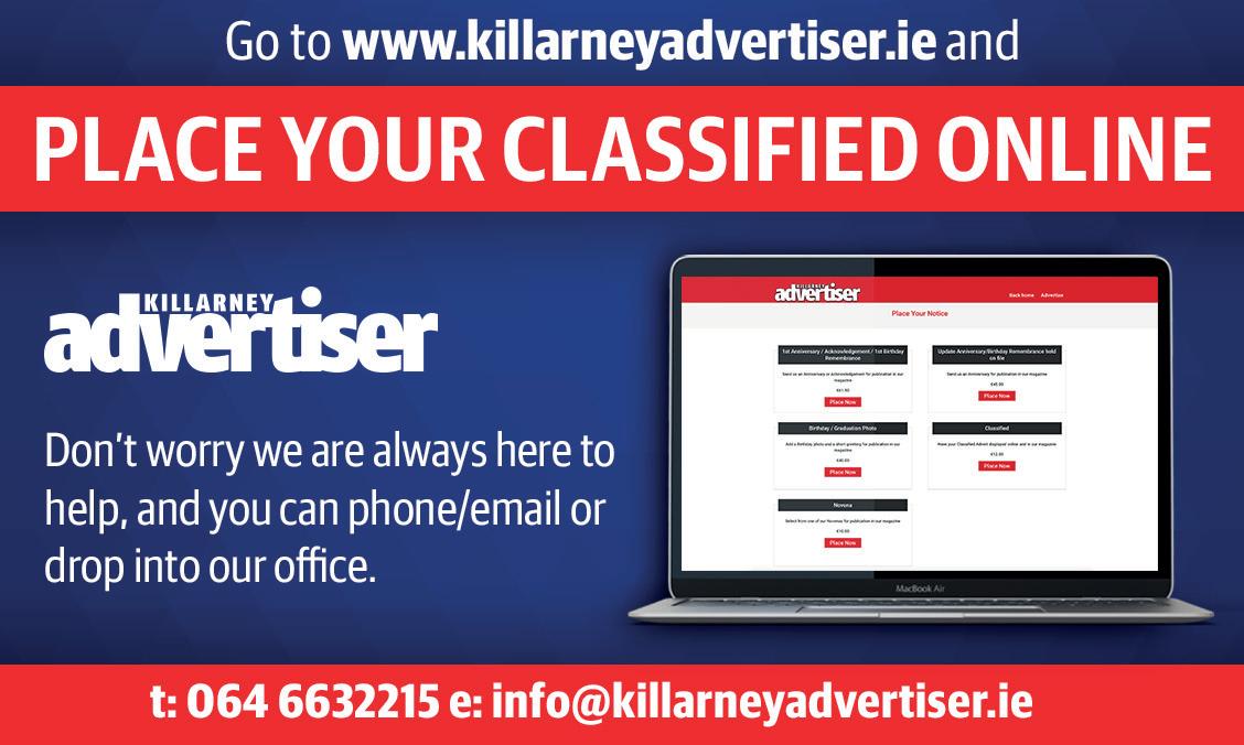 © All images, design and content in the Killarney Advertiser is protected by copyright © for the benefit of the Killarney Advertiser or third parties. No part, image or design may be reproduced in any other publication without the prior appropriate written consent of the copyright holder.