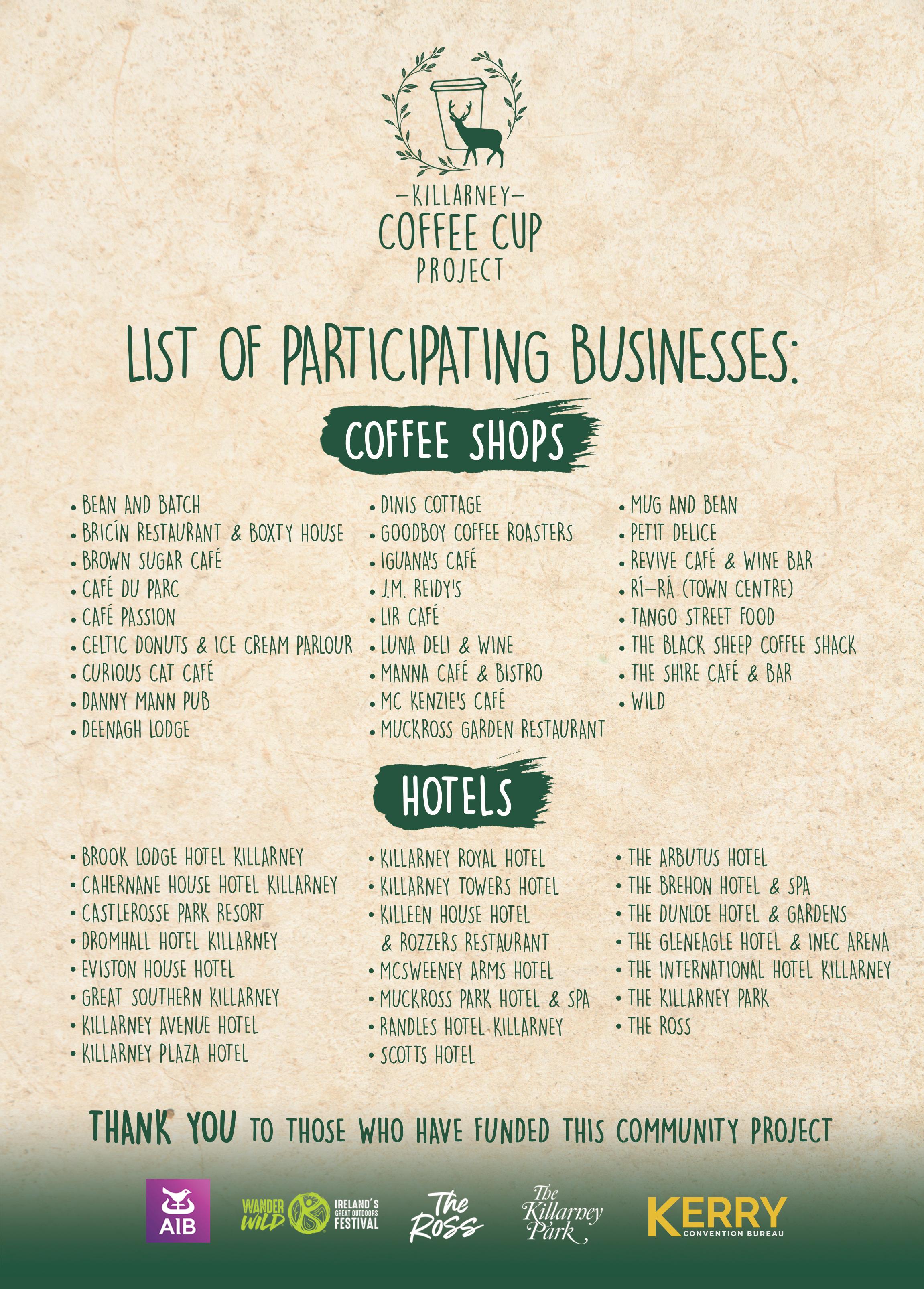 The partnership enables customers to purchase a reusable cup for a €2 deposit which is refundable when the cup is returned at any of the participating locations in Killarney or at 350 existing locations nationwide.