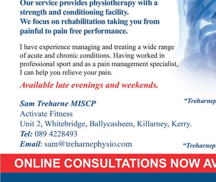 Weekly clinic at Scotts Hotel every Saturday @ 3pm. I am always contactable on 087 2461678