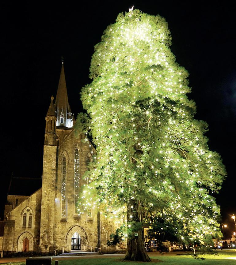 The towering Tree of Light features on the grounds of St Mary’s Cathedral on a landmark giant Californian Redwood tree just outside the main door of the Pugin-designed building.