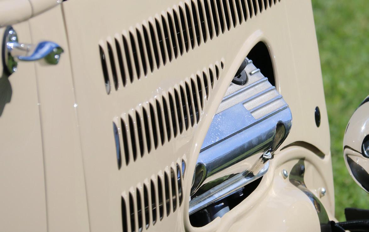 Cool Caramel, was laid down. Before too long, the body was bolted to the chassis. Kamo at Atomic Fabrication had already spent time reshaping the steel hood to match the aftermarket grille shell as well as fabricating the hood sides that allow the Hemi to poke a head out of each side, in a little teaser of what is providing the power. He then had the car again to design and fabricated the fenders and brackets that cover those 15x4 and 16x5-inch Vintech steel wheels with Firestone rubber.
