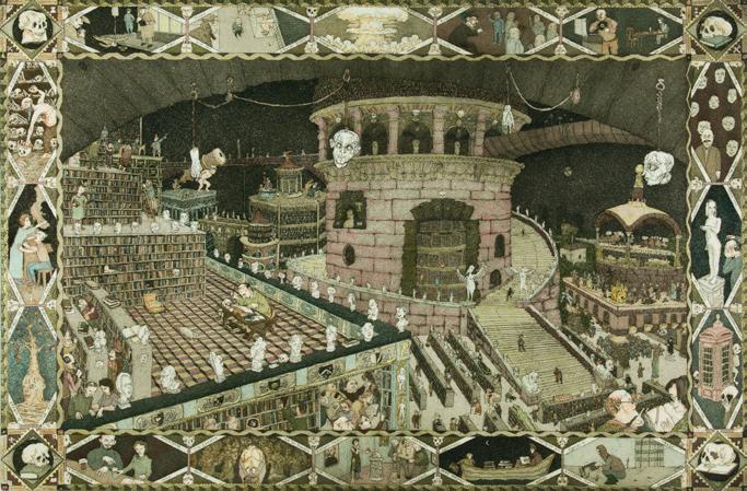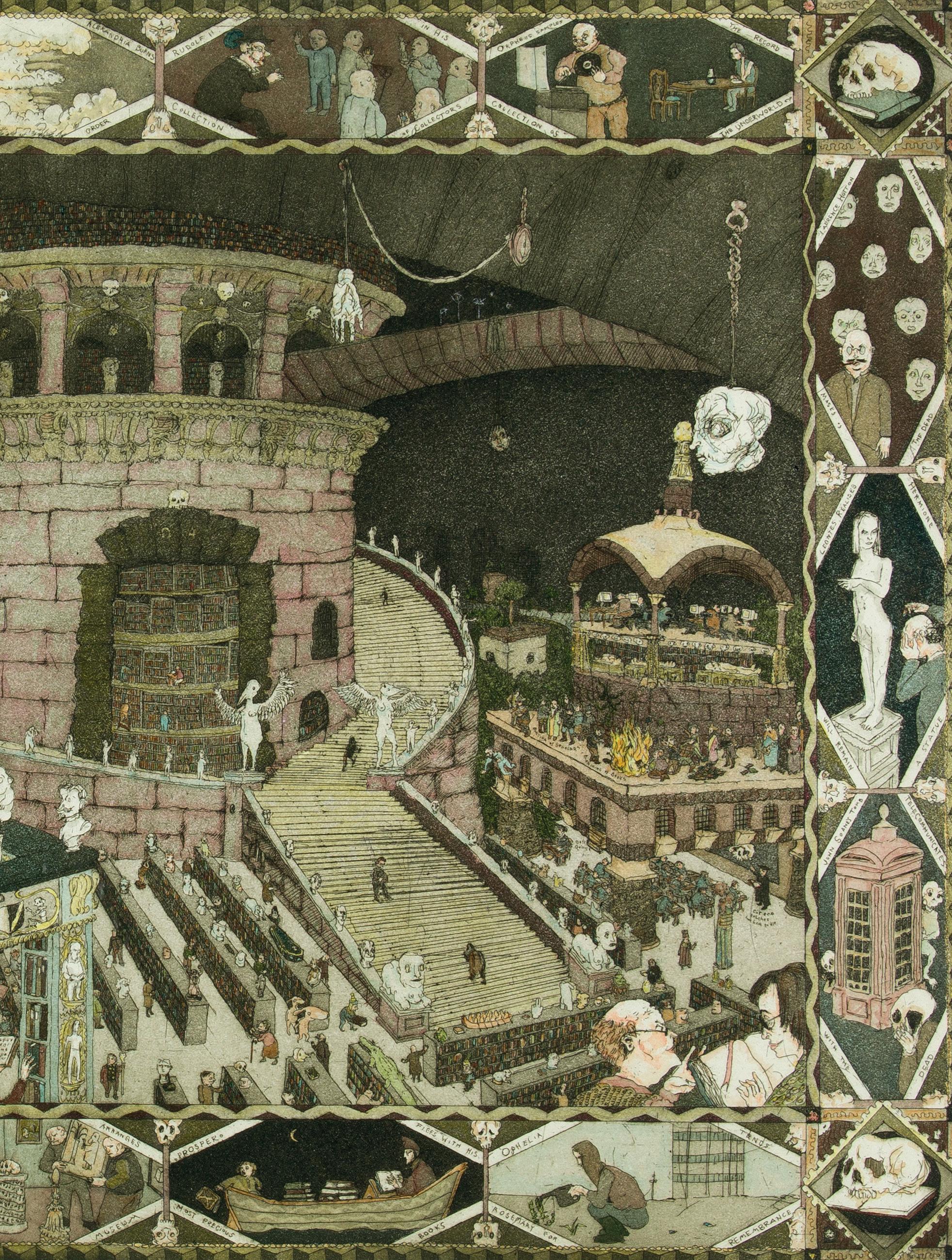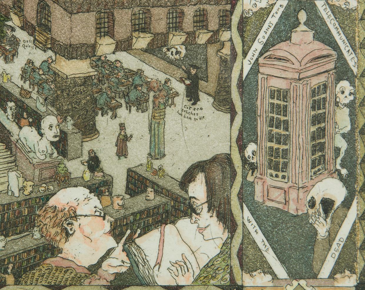 a list of those named, and illustrated a few of the panels in photographs. To go further, you will have to follow Powell’s reading list, and learn the tale of each individual ghost paged within the library’s walls. It is also worth looking up the word ‘aedicule’ before you enter. An aedicule was a shrine or a small niche in a larger building. In this way a church (or a library) could be vast and infinitely small at the same time. You could put an aedicule within an aedicule and so on infinitum. In this way, all ghosts and stories can be contained in one place.